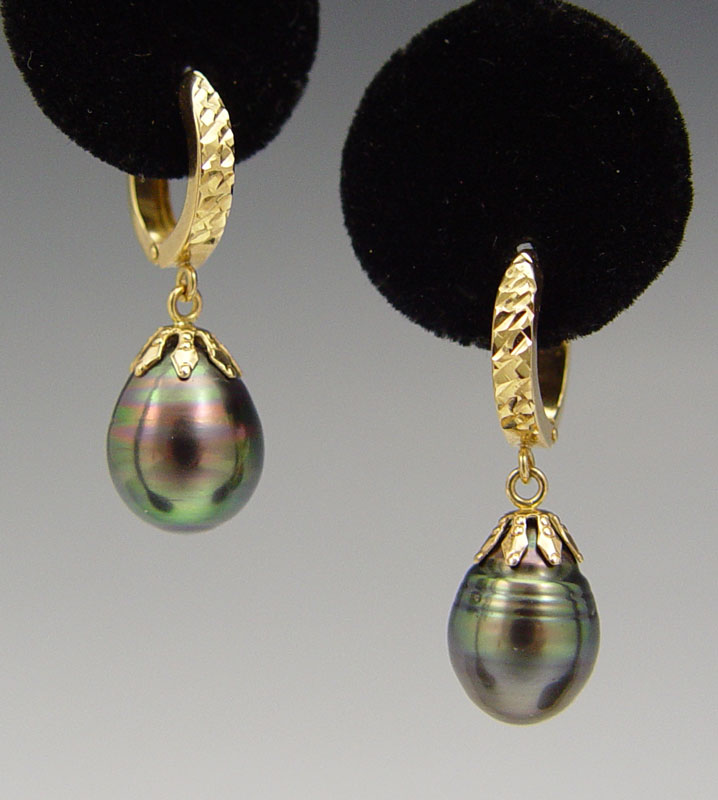 14K BLACK PEARL EARRINGS: 14K yellow gold earrings dangling two 10.00 mm cultured circle pearls. Black in color. Origin of the pearls is unknown. The pearls are peg and epoxy set. Pivot post closures. Weight: 4.6 grams.
