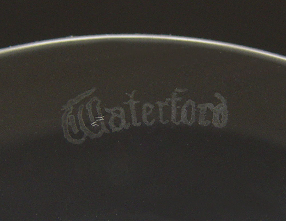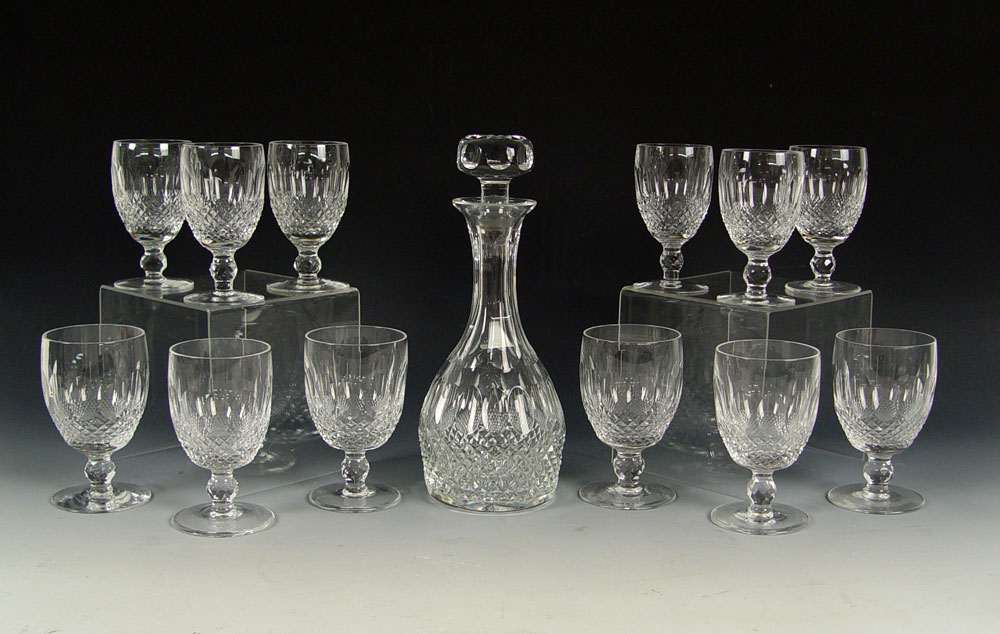 WATERFORD COLLEEN DECANTER AND GOBLETS: Decanter with stopper, 11 1/2''h. 6 stems, approx. 4 3/4'' and 6 stems approx. 5 1/4''.