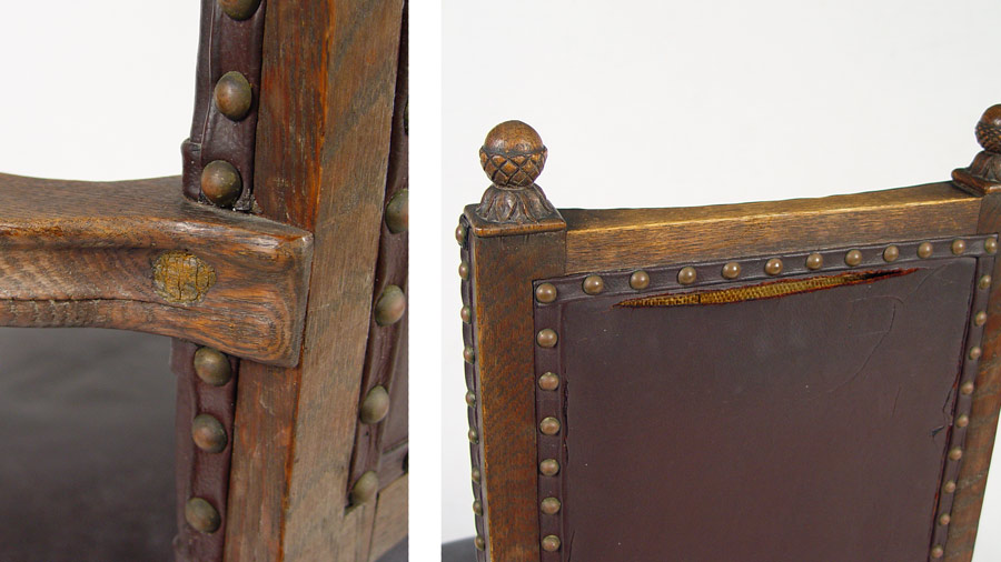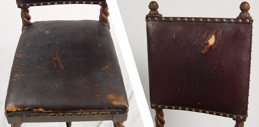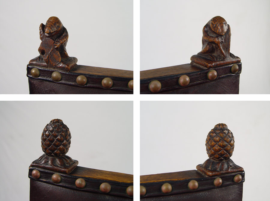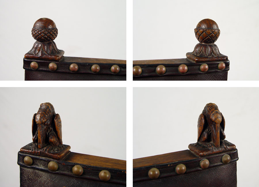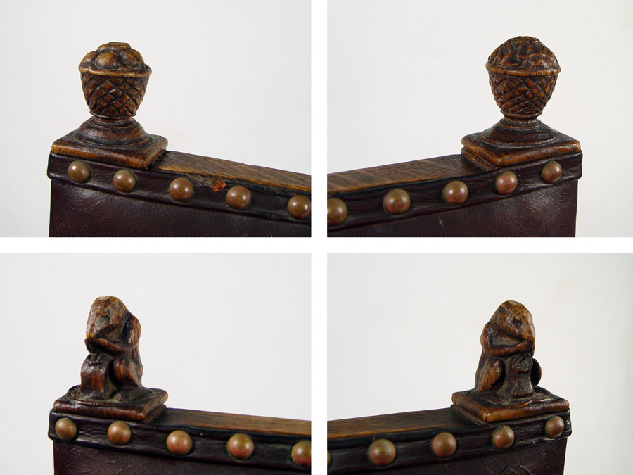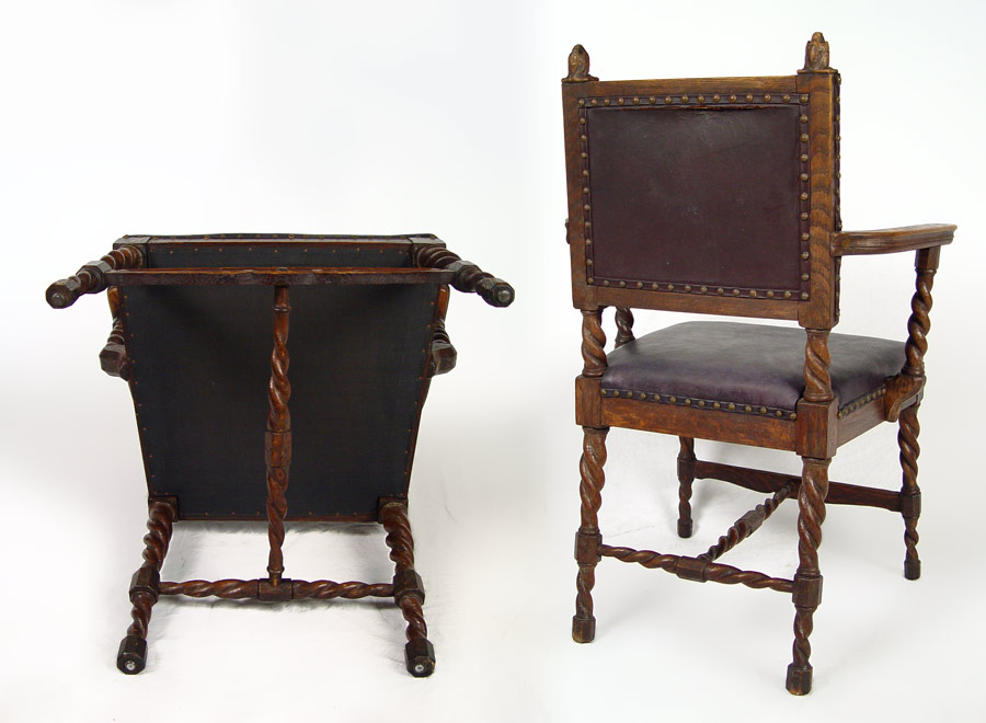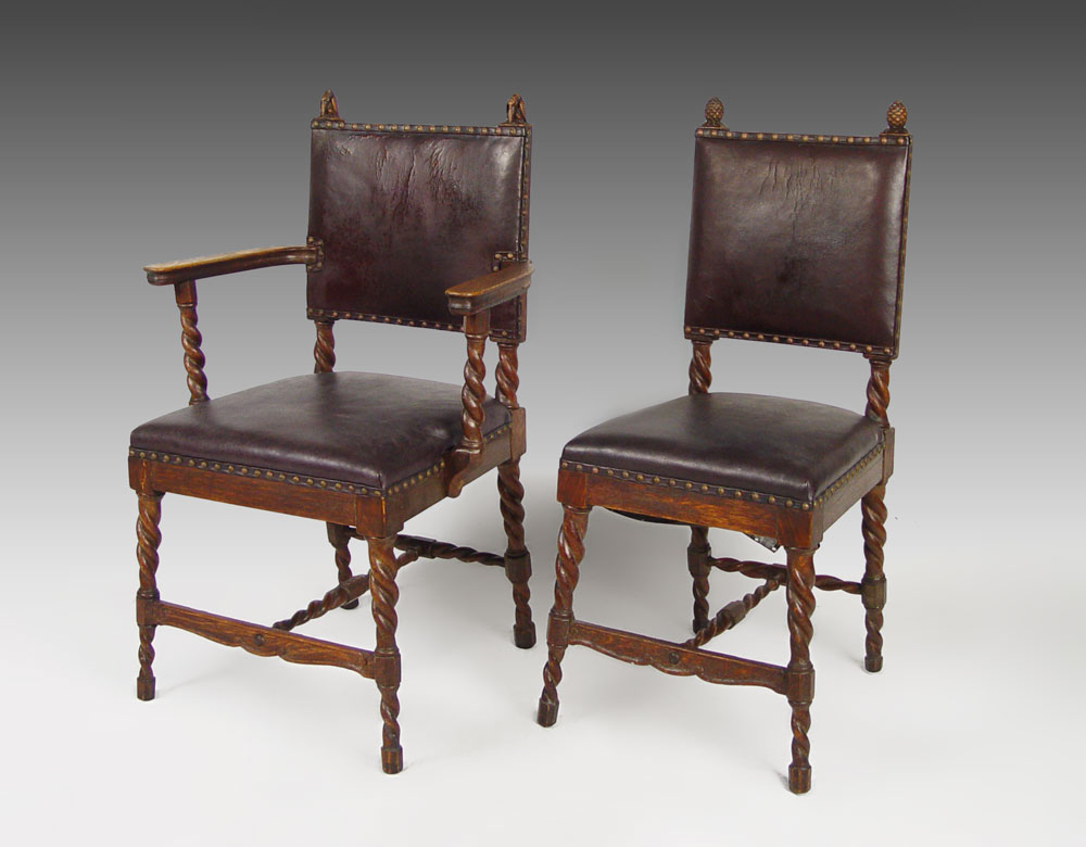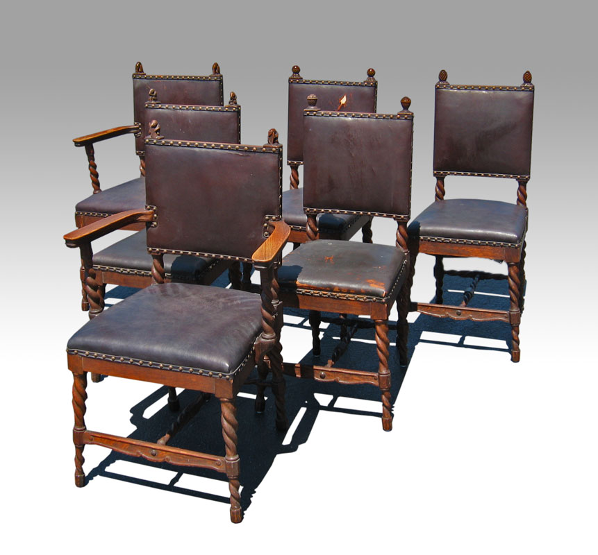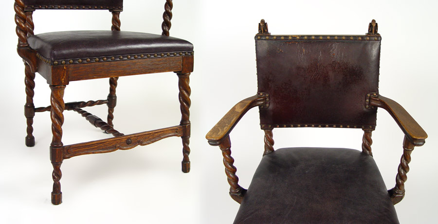 RARE SET OF 6 ENGLISH OAK BARLEY TWIST DINING CHAIRS: Four straight and 2 arm barley twist chairs. Each chair with unique individually carved finial figures - anthropomorphic animals, fruit baskets, carved pineapple, pelicans. Overall solid construction, worn leather. Arm chairs are 38'' tall x 25'' wide x 20'' deep.