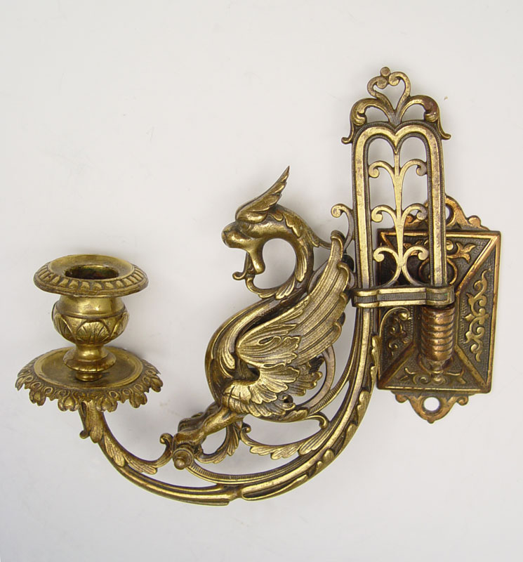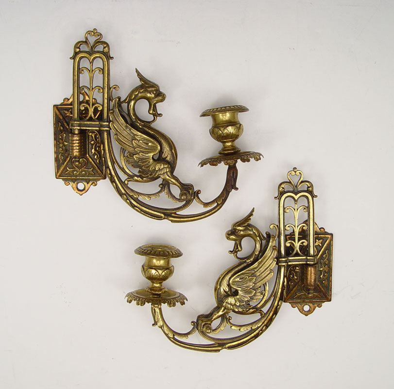 ANTIQUE BRASS CANDLE SCONCES: Pair of dragon or griffin motif candle wall sconces, 8 1/4'' from wall, approx. 7 1/4'' x 2 1/4''.