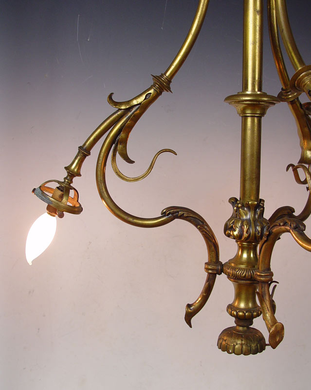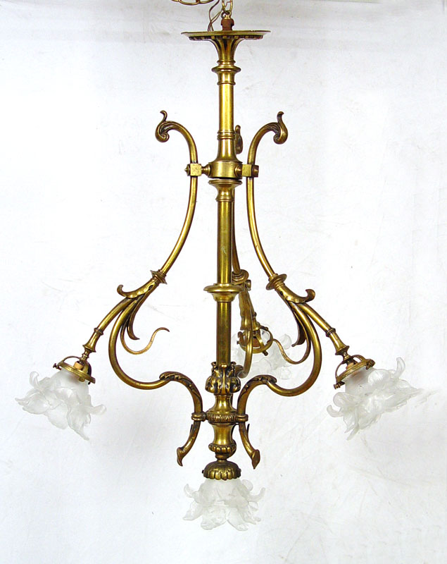 BRASS 4 LIGHT HANGING CHANDELIER: Floral motif shades, 28 3/4'' h. x 20'' dia.