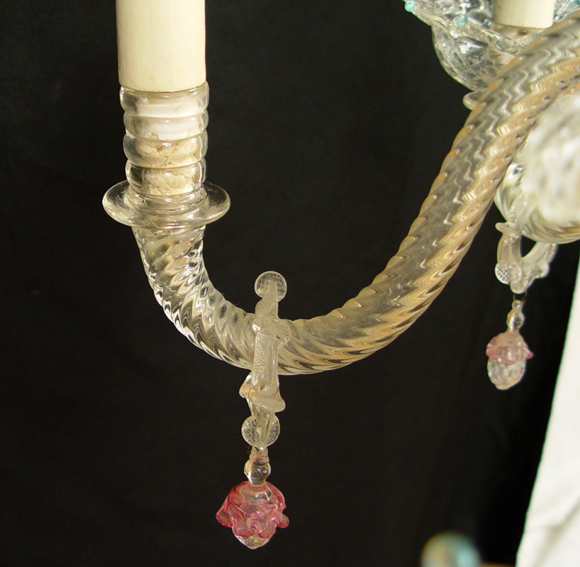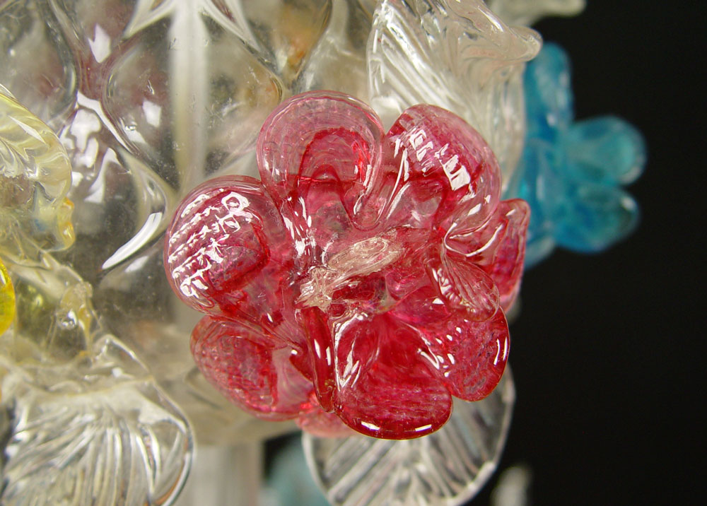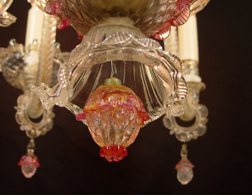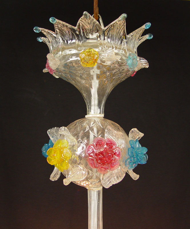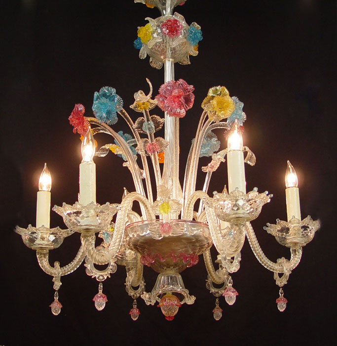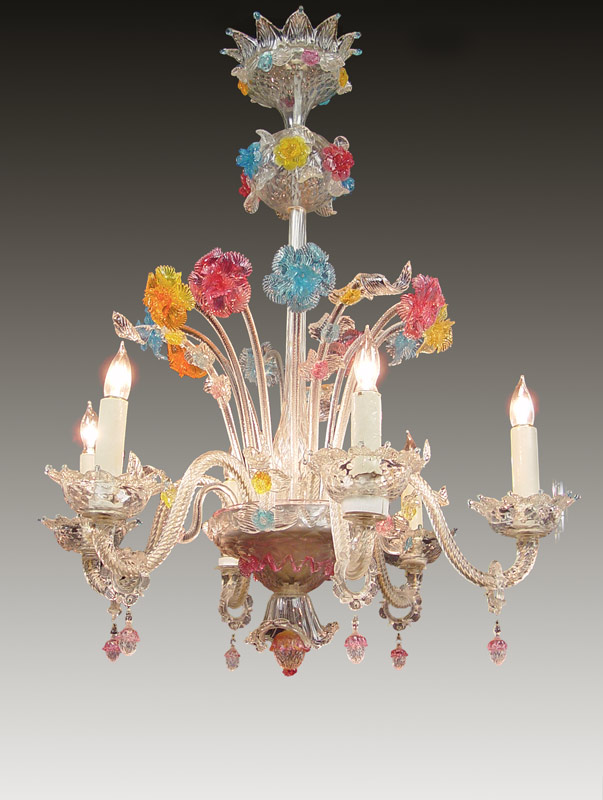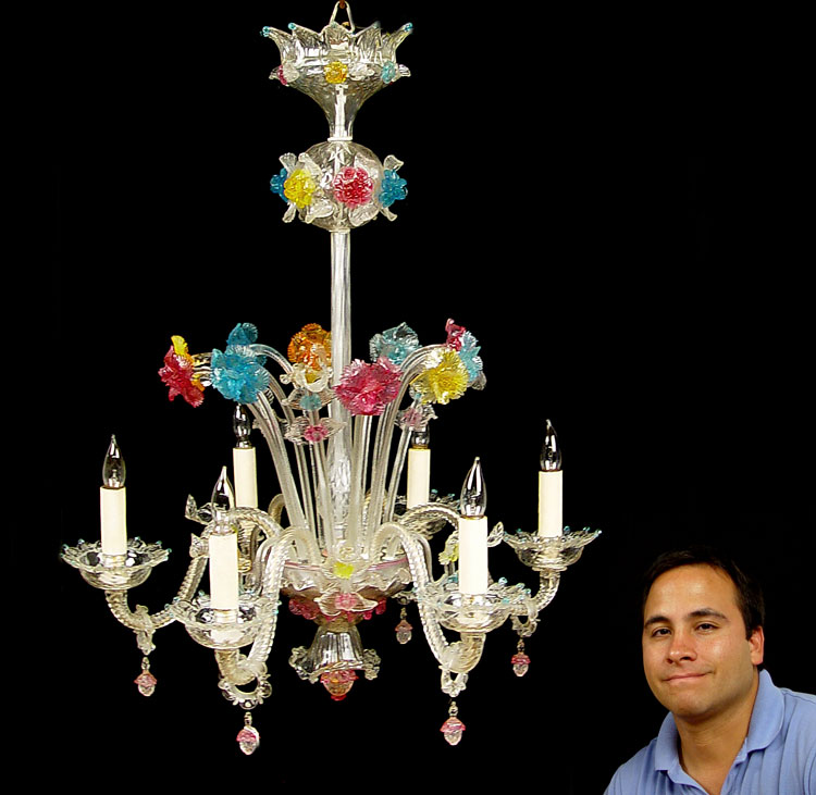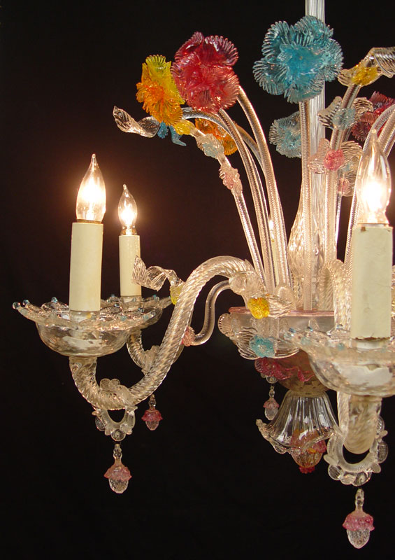 FLORAL 6 ARM VENETIAN GLASS CHANDELIER: Multi color flowers applied to the clear glass. Drop pendant and central finial. Approx. 38 1/4'' x 30'' dia.