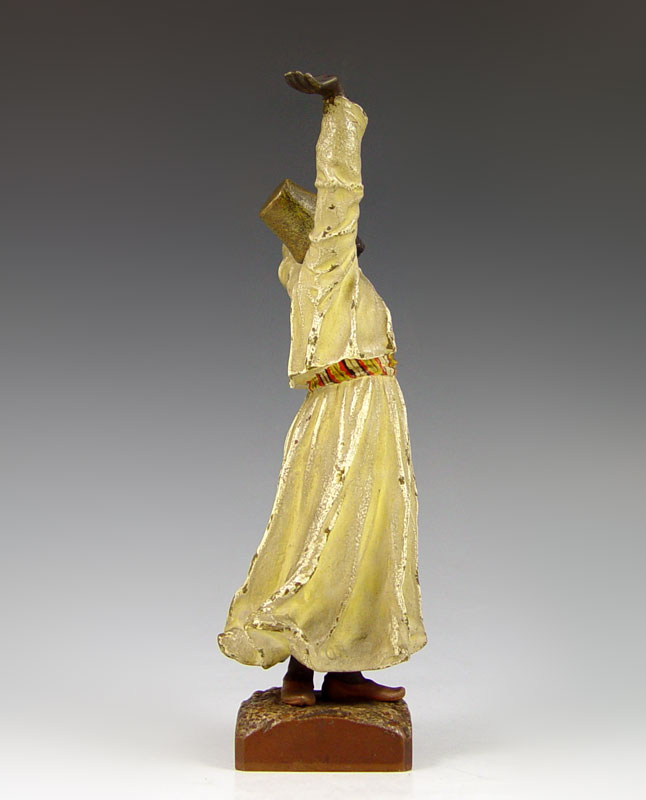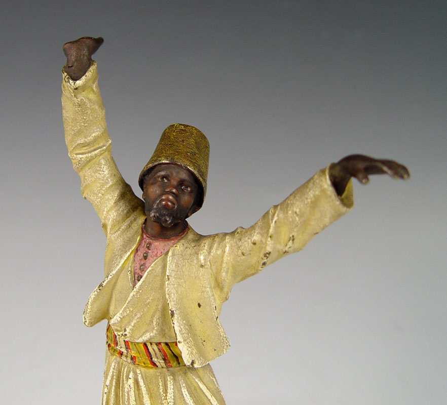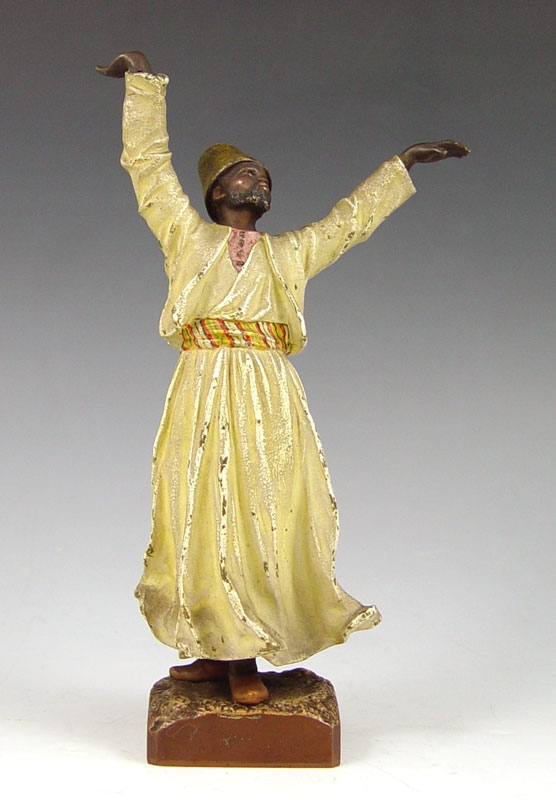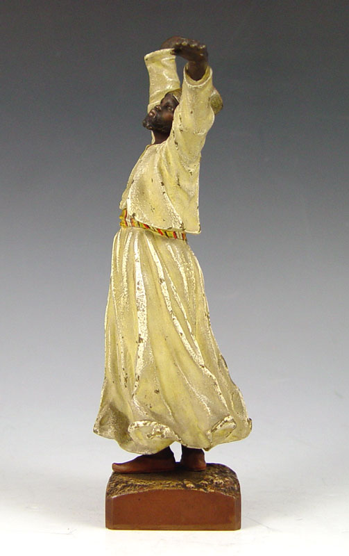 BERGMAN AUSTRIAN BRONZE ORIENTALIST TWIRLING DERVISH: Franz Xavier Bergman (1861-1936). Cold painted bronze figure. Impressed B in vase mark, 8 1/2'' tall.