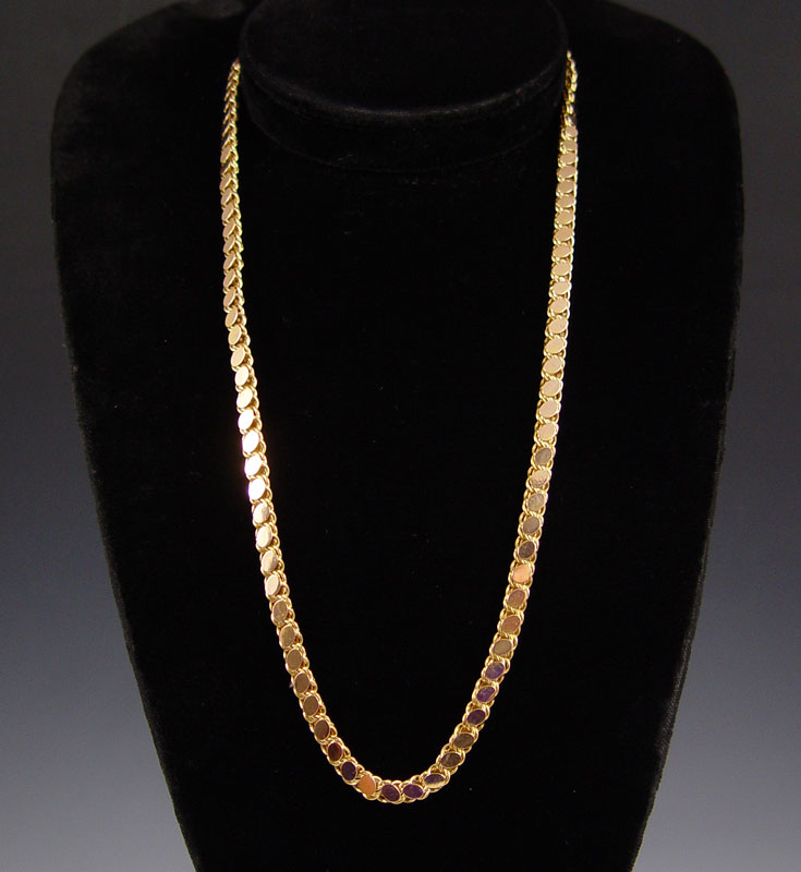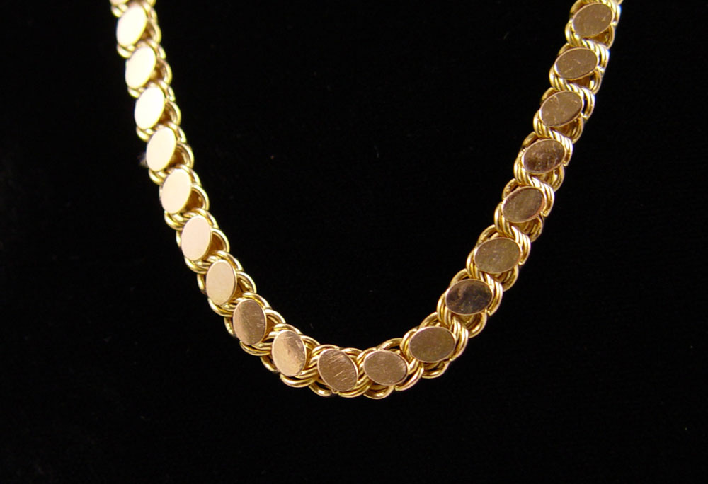 18K GOLD FANCY LINK CHAIN: 18K yellow gold chain with double circle and oval plaque links. Lobster claw clasp. Length: 20'' Weight: 18.6 grams.