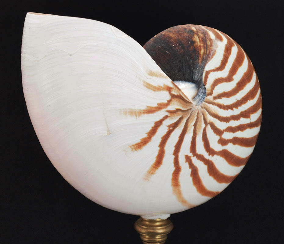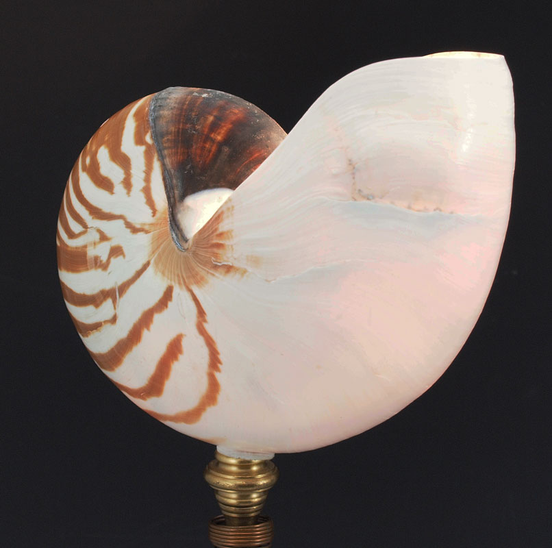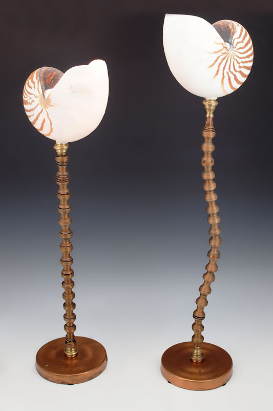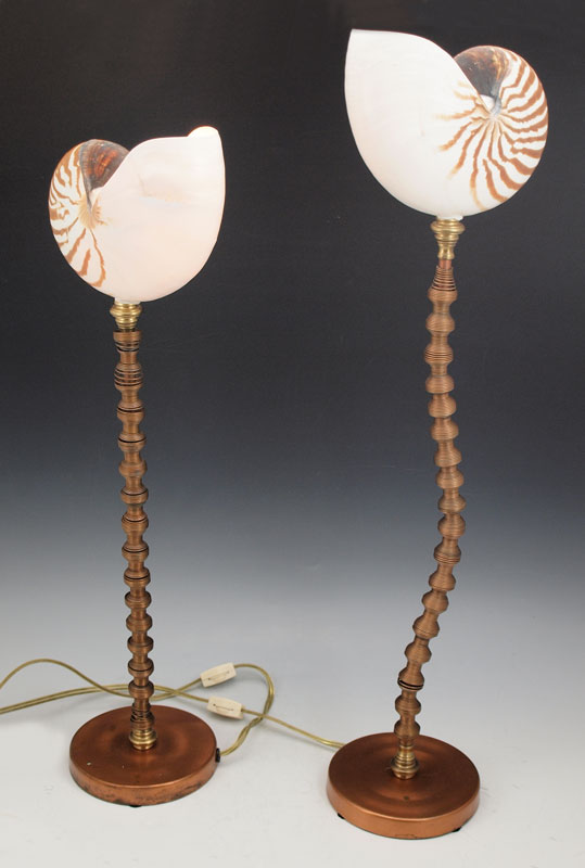 PAIR NAUTILUS SHELL TABLE LAMPS: Natural nautilus shell tops on whimsical expanding copper tube stands. One measures 22 1/2'' h., other 25 1/2'' h.