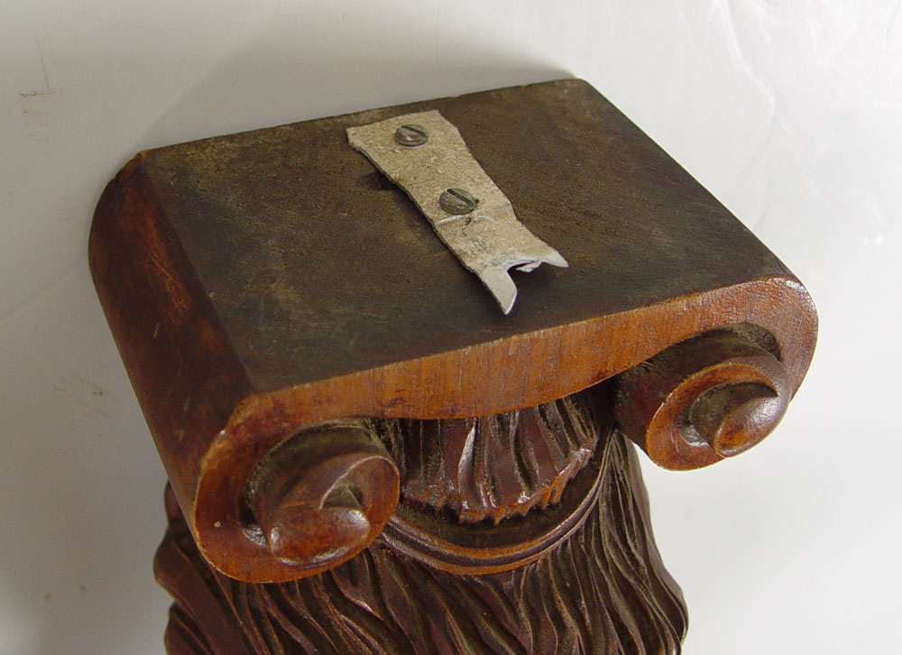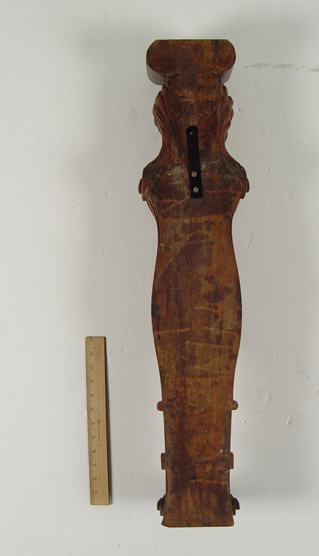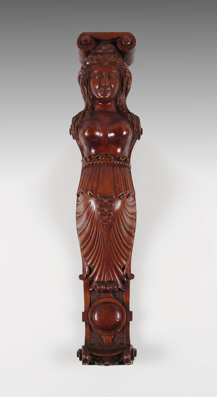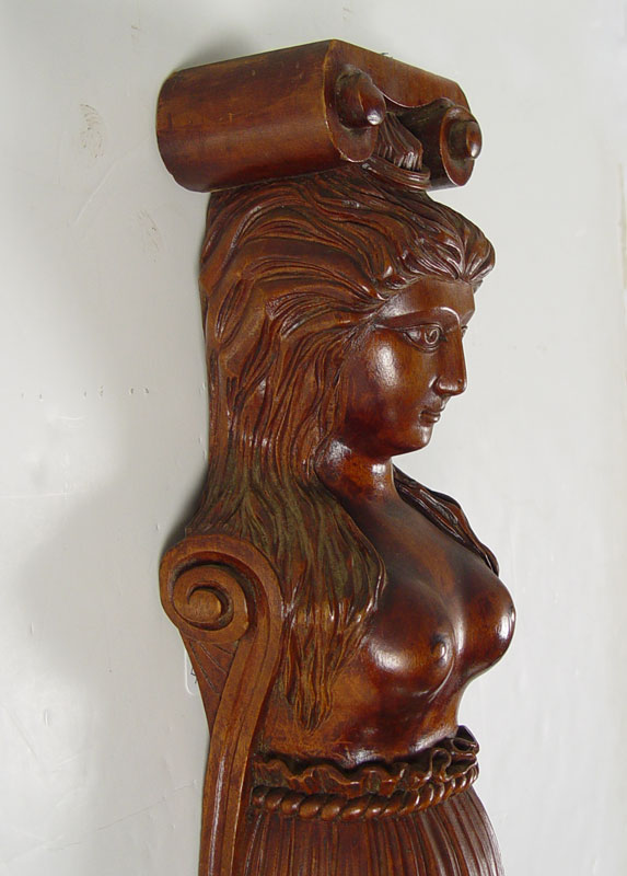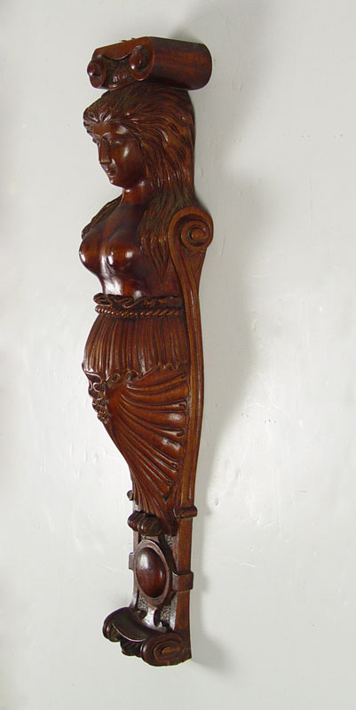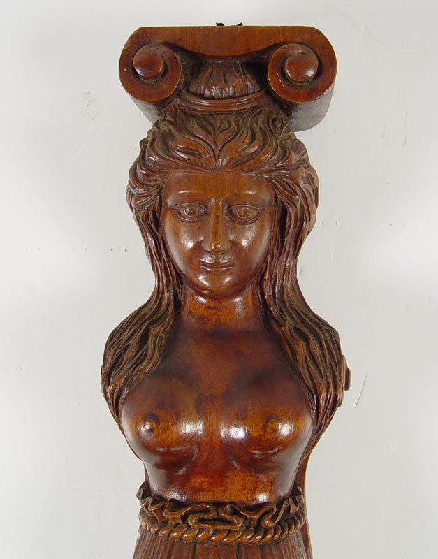 CARVED FIGUREHEAD WALL HANGING: Bare breasted maiden with foliate skirt, 31 1/4'' x 7 1/2'' x 5''.
