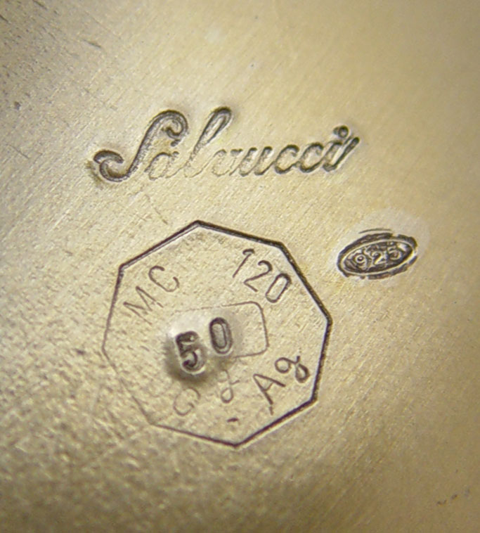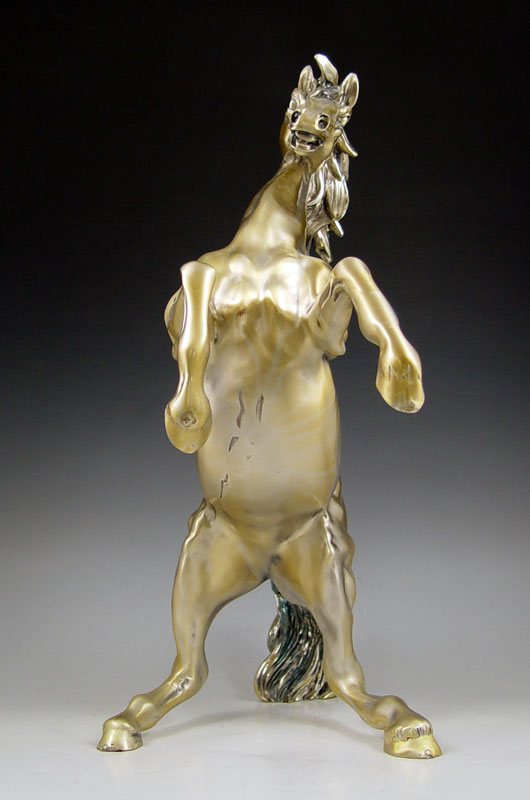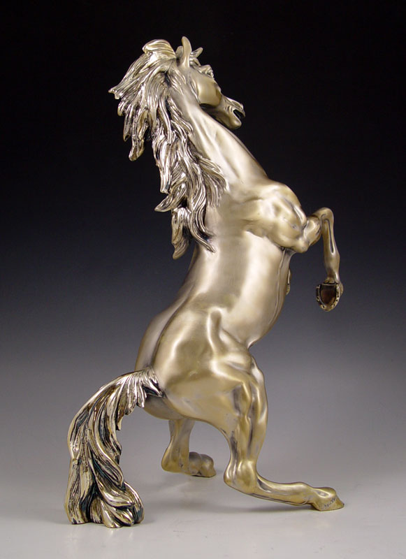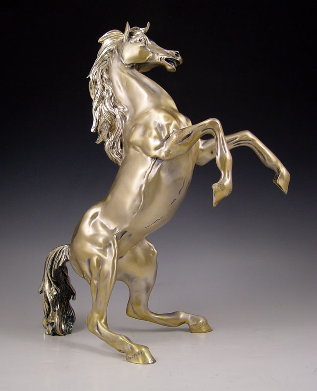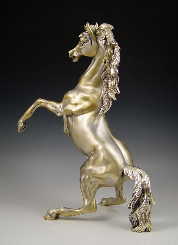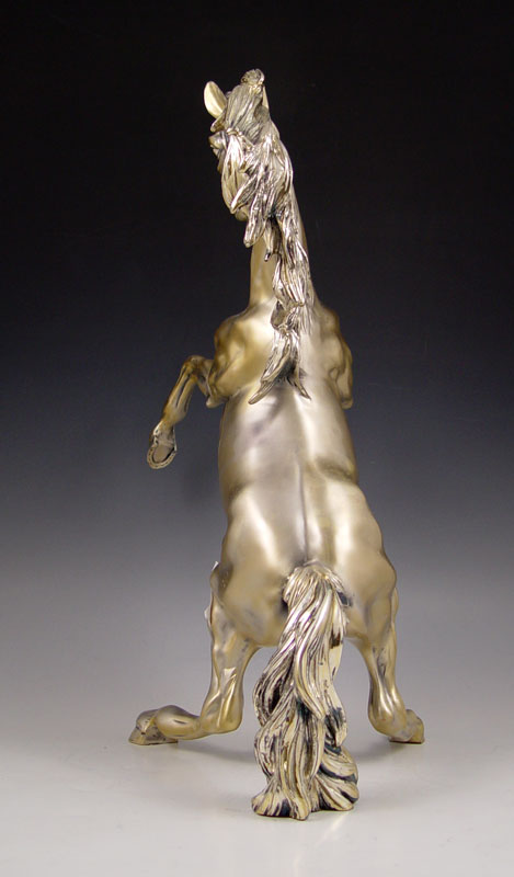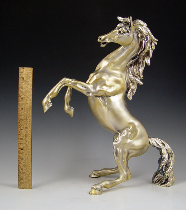 STERLING SILVER ITALIAN STALLION SALVUCCI: Sterling silver over unknown base material figure of a stallion rearing. Marked Salvucci with 925 mark and other hallmark. 17 1/2'' h. x 14 1/2'' x 8''.