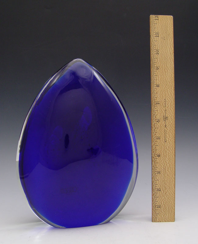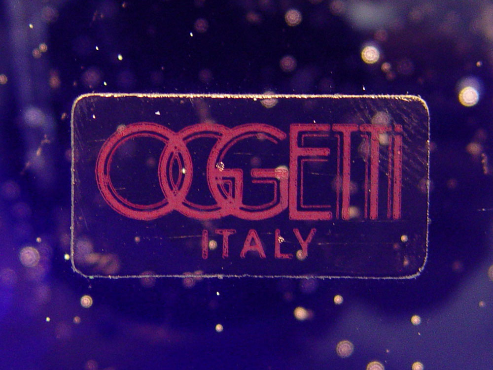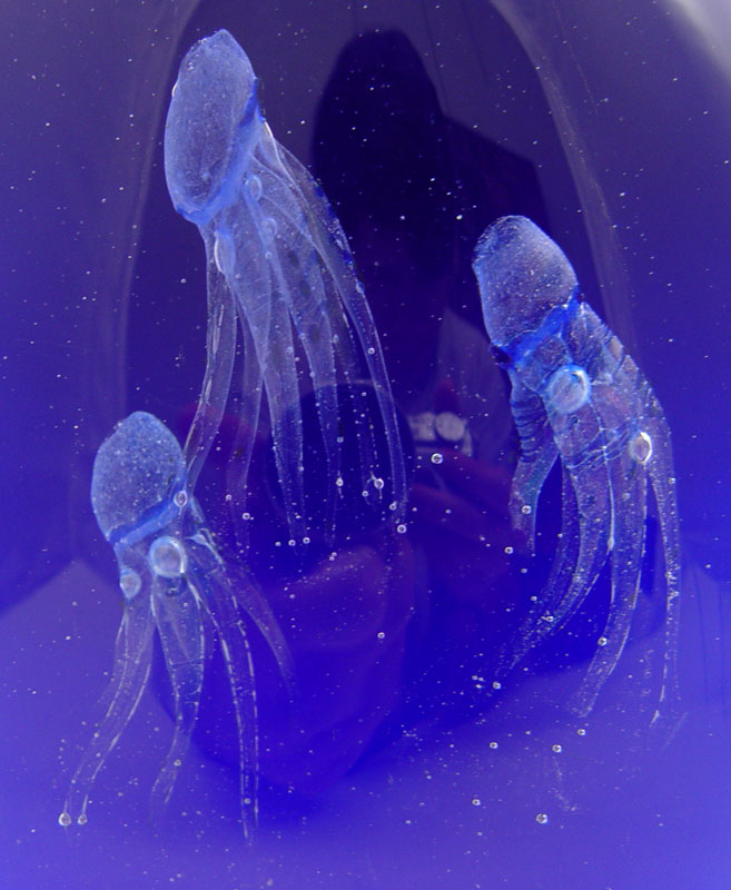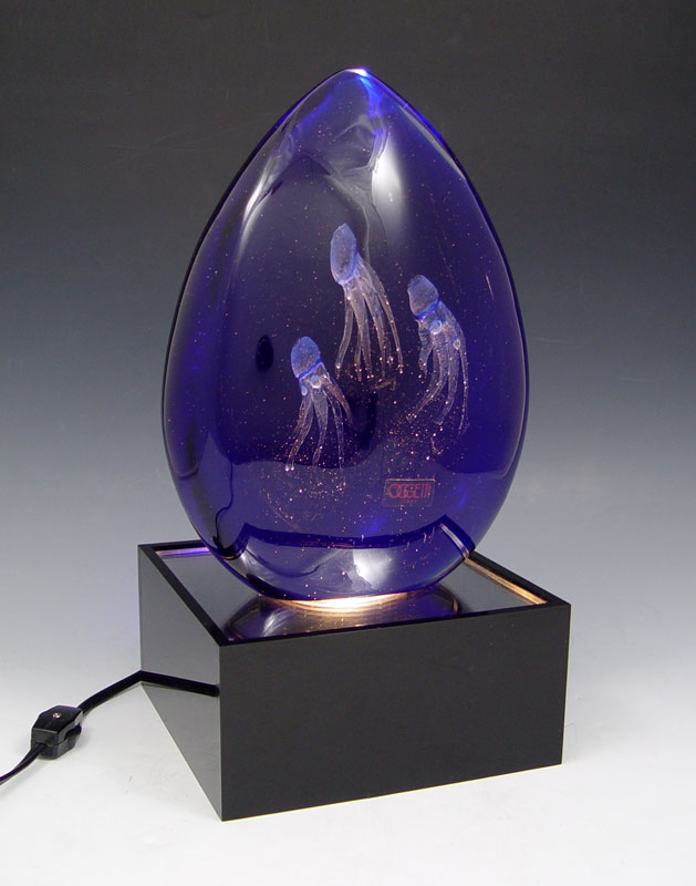 OGETTI GLASS SCULPTURE: The interior with squids or jelly fish. 10'' tall x 7'' wide. Accompanied by the black acrylic lighted base, 3'' tall x 6 1/2''.