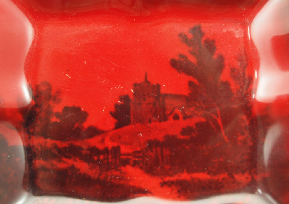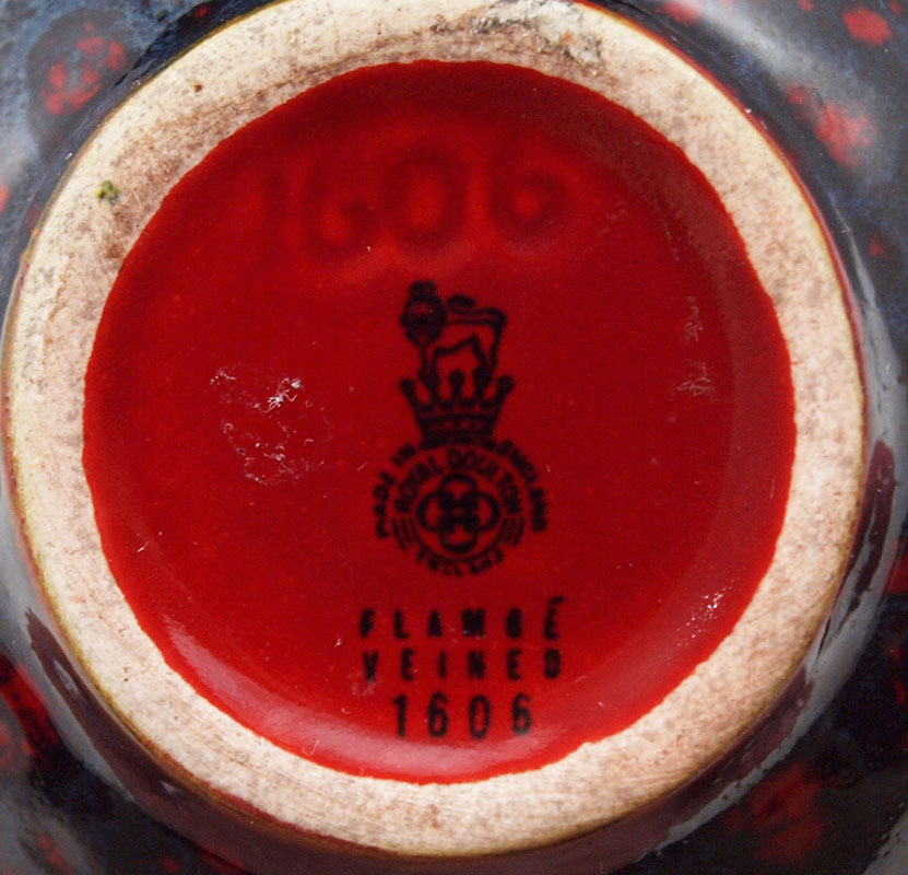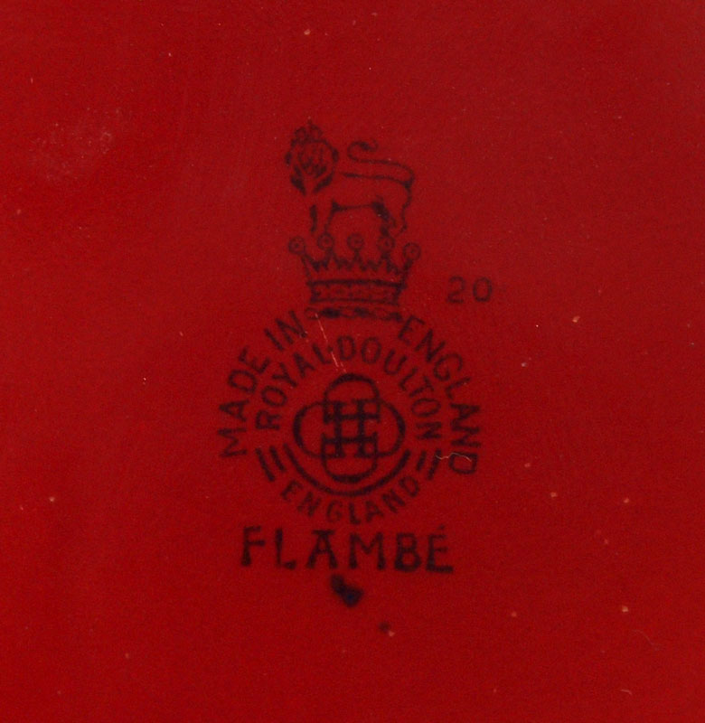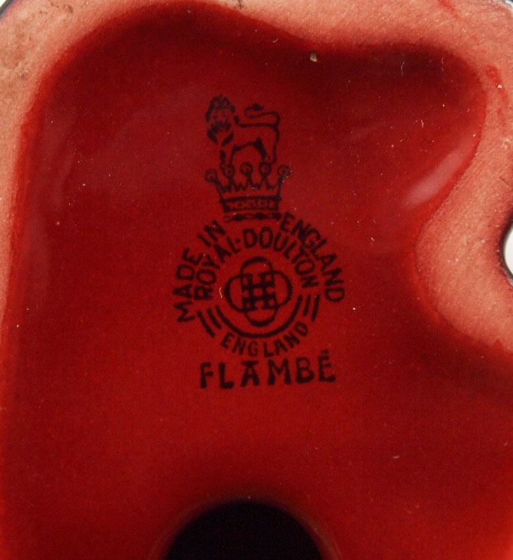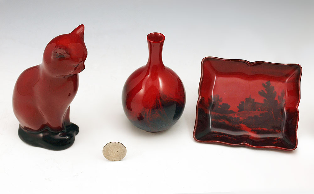 3 PIECE GROUP ROYAL DOULTON FLAMBE: 1) Sitting cat, 5 1/4'' tall. 2) Bottle neck vase, 4 1/2''. 2) Scenic landscape pin tray, 3 1/2'' x 4''.