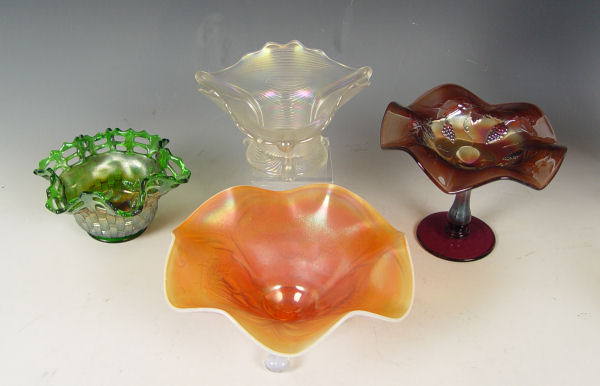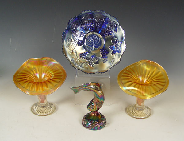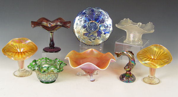 8 PIECE GROUP OF CARNIVAL GLASS: Featuring a white Northwood Drapery vase 3 7/8''h. x 6 1/2'', cobalt Vintage Leaf dish 7 1/2''dia., green Fenton Basket Weave 3 1/4''h. x 6'', Blackberry compote 5 1/4''h. x 6 7/8'', pair of marigold Jack in the Pulpit vases one with spiral crack to stem 6''h. x 5 3/4'', and a fish 5 1/4''h. Sold as a lot.