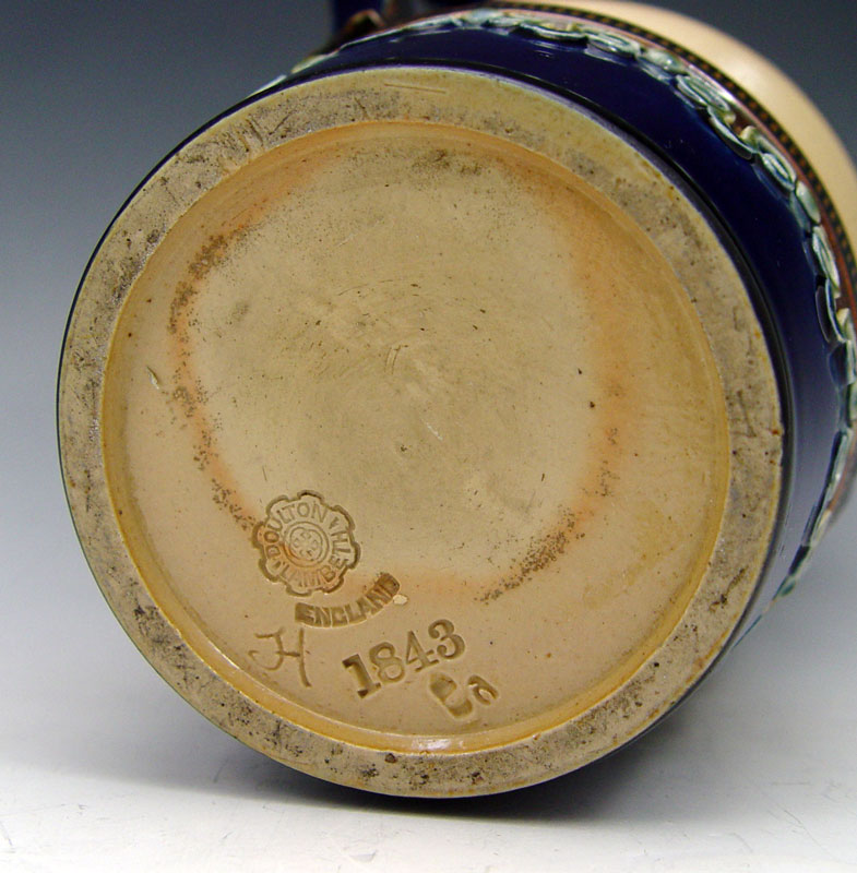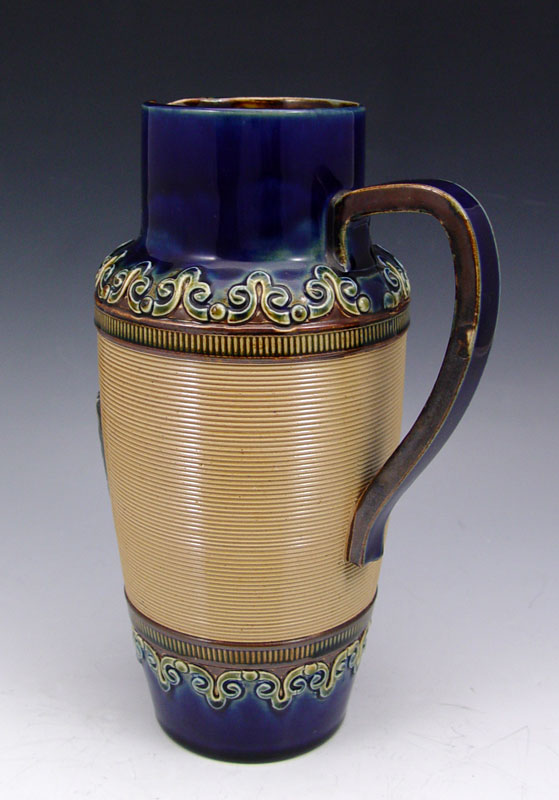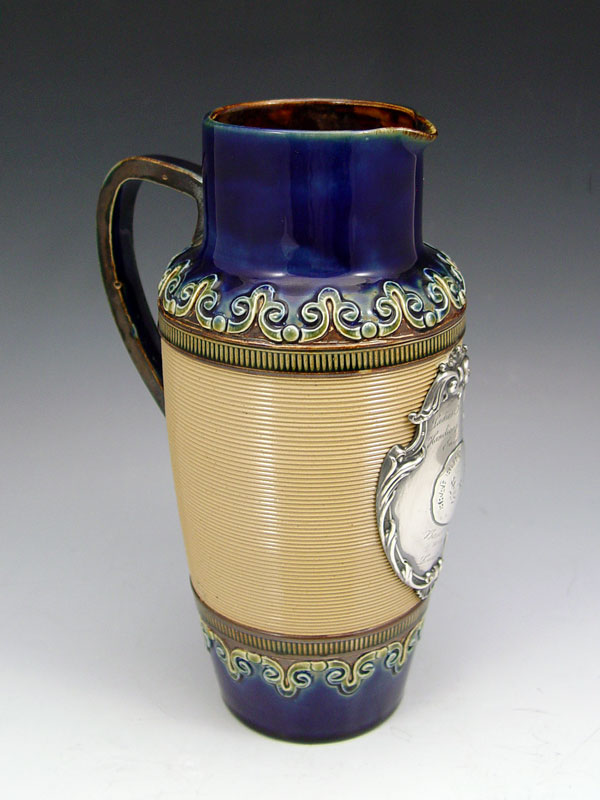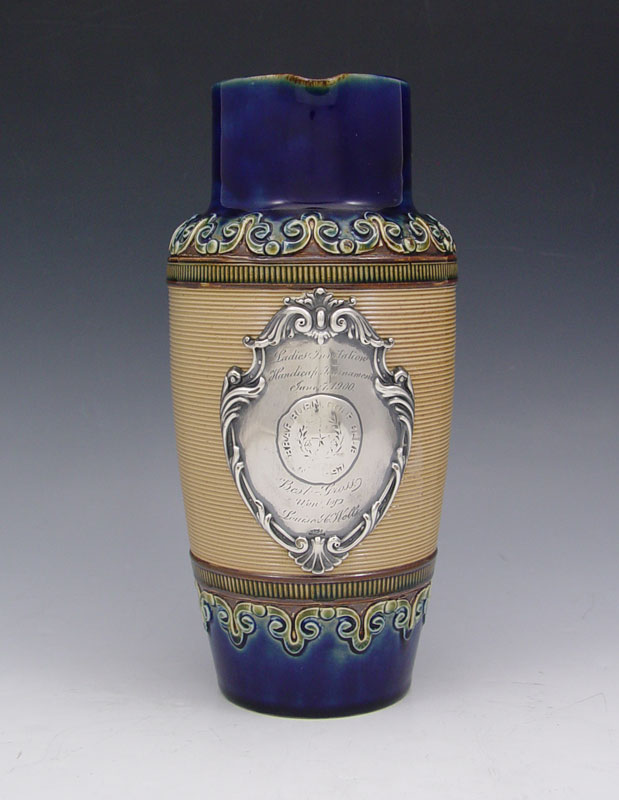 DOULTON LAMBETH PRESENTED GOLF TROPHY PITCHER: Doulton Lambeth stoneware pitcher with sterling mounted presentation for 1900 Braeburn Golf Club. Sterling plaque by Goodnow & Jenks reads ''Ladies Invitation Handicap Tournament June 7, 1900, Best Gross Won by Louise H. Wells''. Impressed Doulton Lambeth stamp and 1843 on base. Artist mark for Joan Honey. 9 1/4'' h. x 6''.