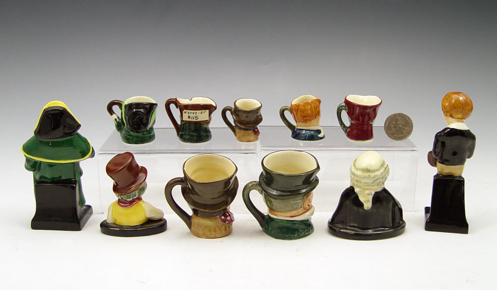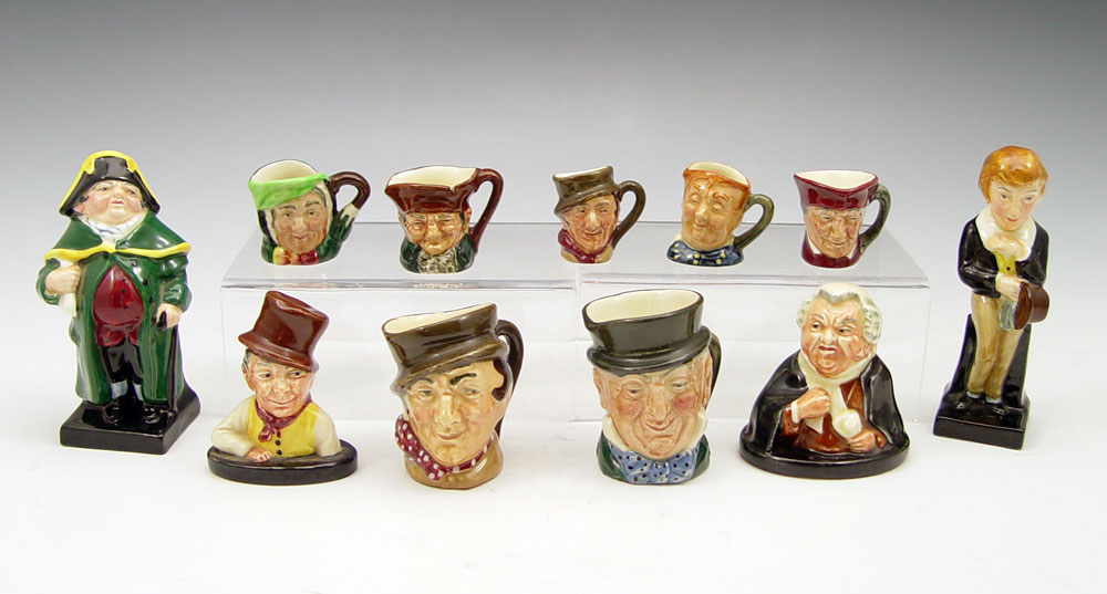 11 ROYAL DOULTON FIGURES AND MUGS: Tiny Mugs approx. 1 3/8''h. - Fat Boy, The Cardinal, Sam Weller, Old Charlie, Sairey Gamp; and Mini Mugs approx. 2 1/4''h. - Sam Weller, Mr. Micawber. Figural busts of Sam Weller and Buzfuz. Full figures of David Copperfield and Bumble. Sold as a lot.
