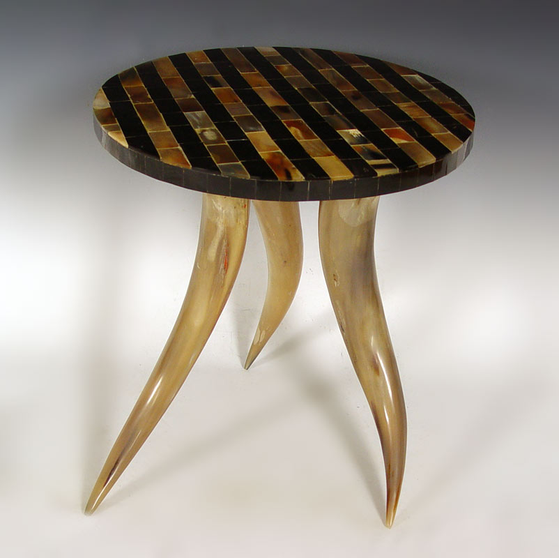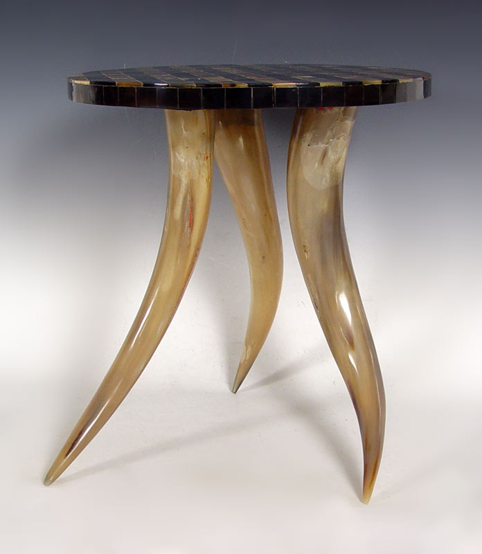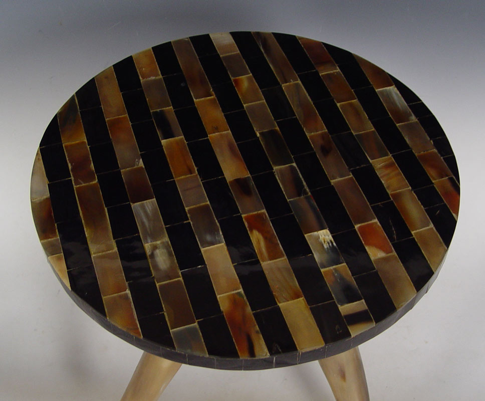 HORN LEG SIDE TABLE WITH MOSAIC TOP: Made in India, three horns support the mosaic of horn tile table top. 19'' tall x 18 1/4'' dia.