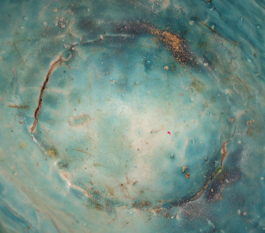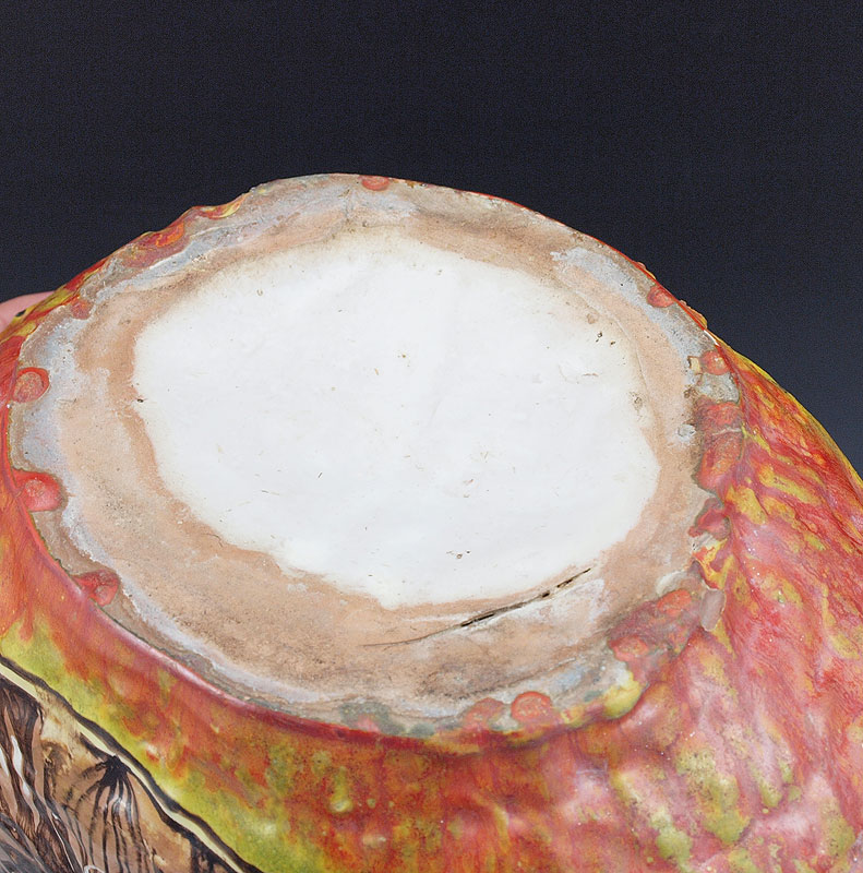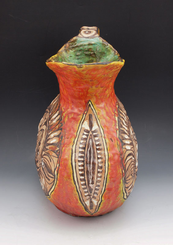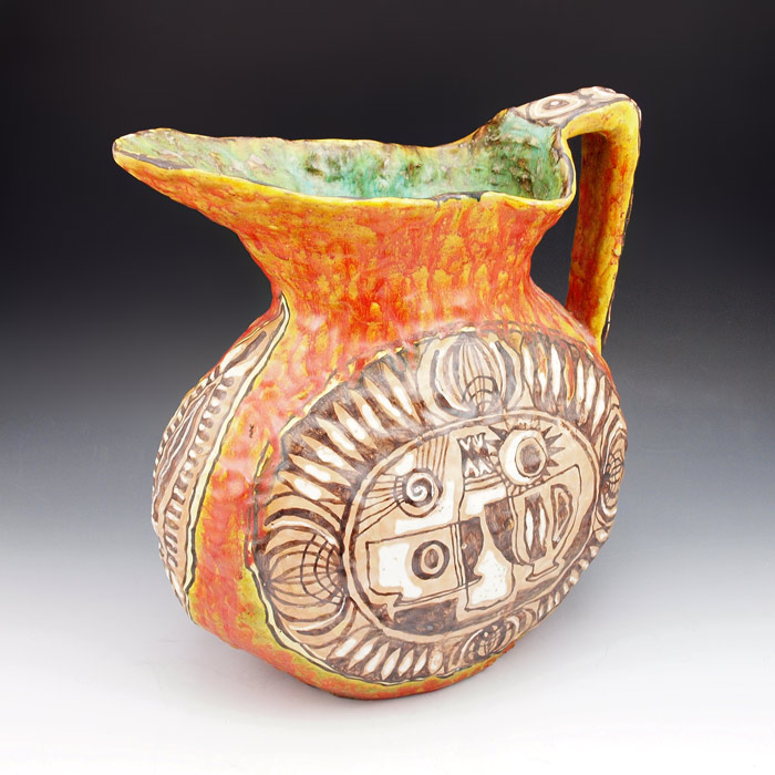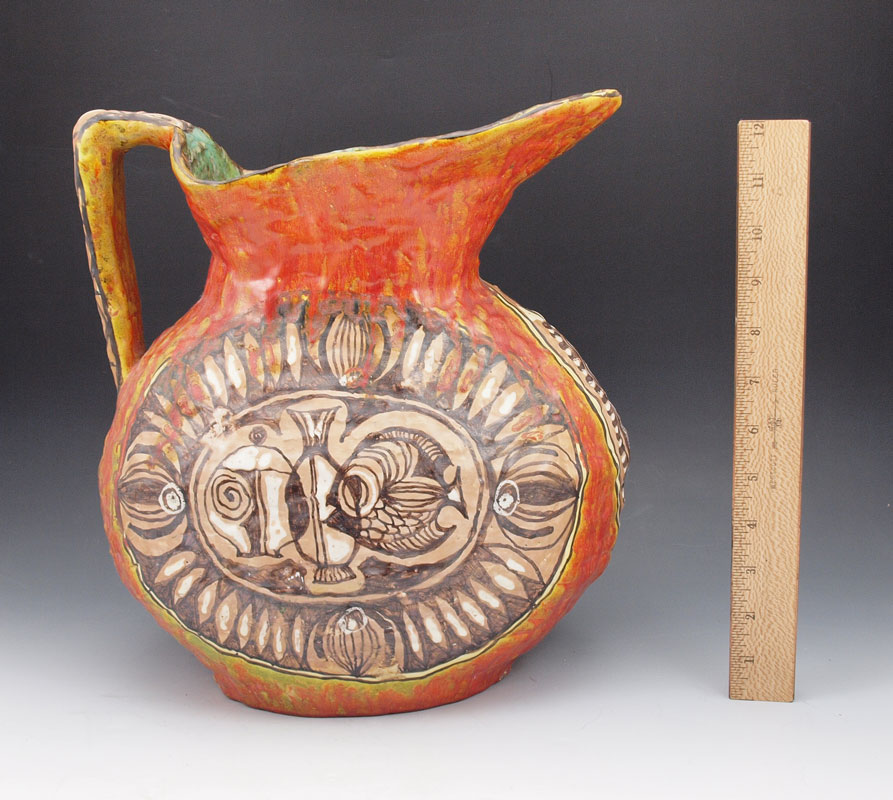 MID CENTURY POTTERY PITCHER: Exaggerated texture, hand painted still life on each side. 12 3/4''h. 11 1/2'' at the widest. Unidentified.