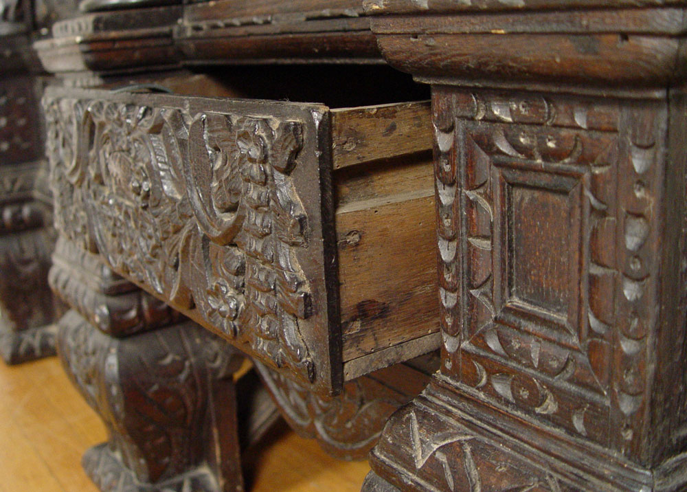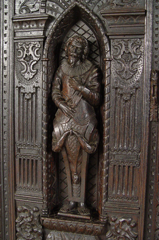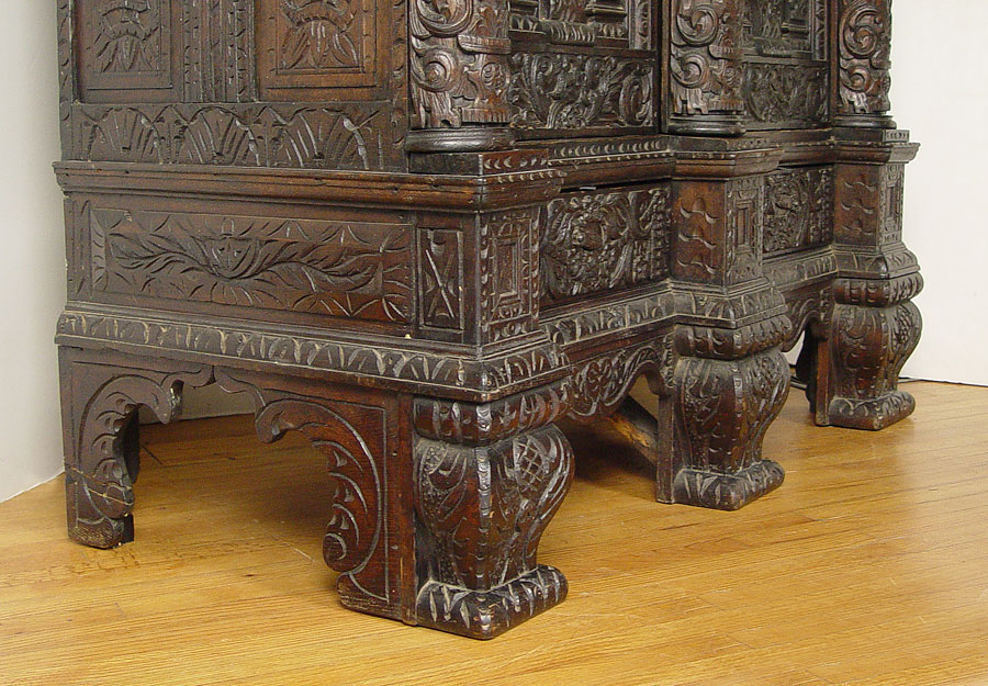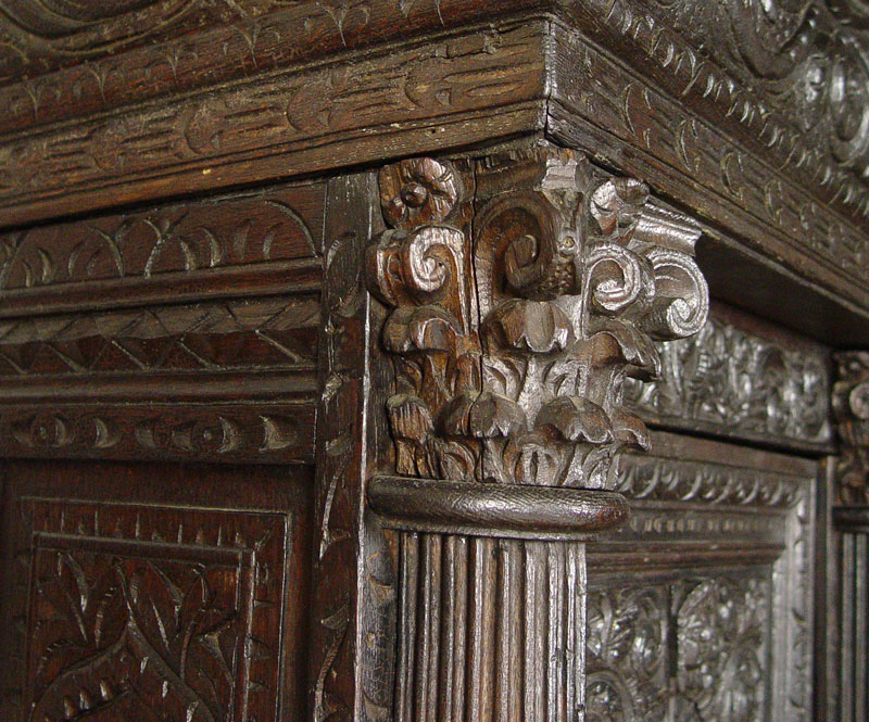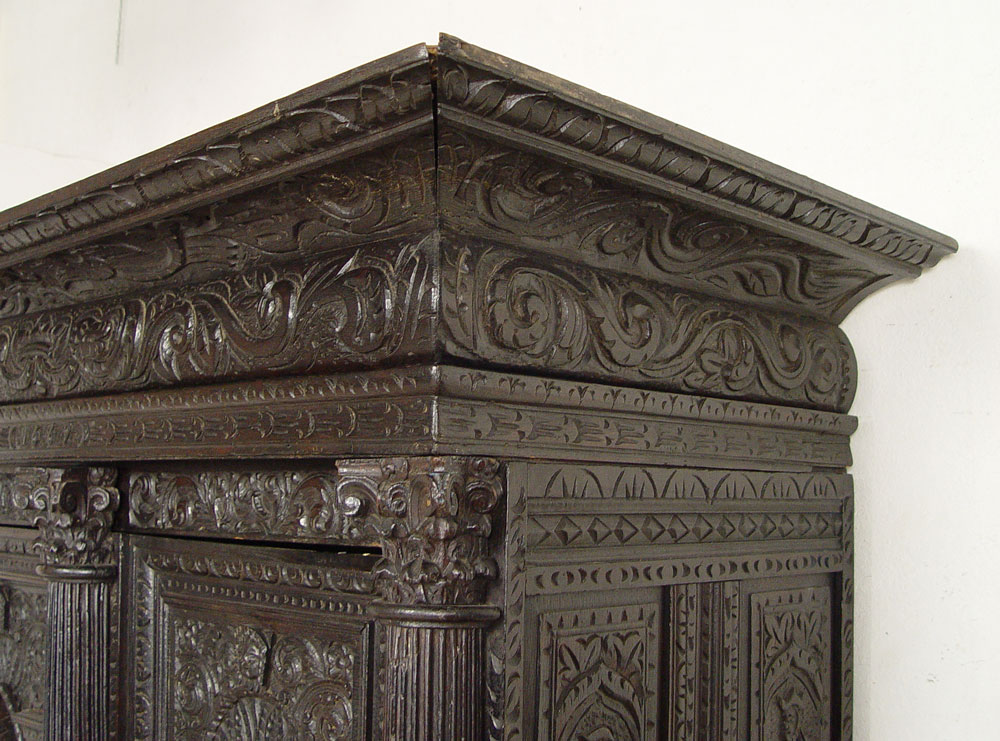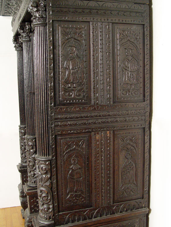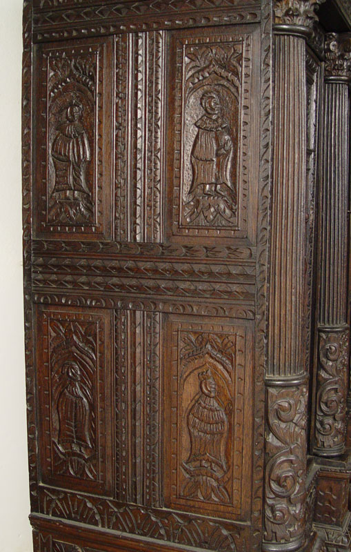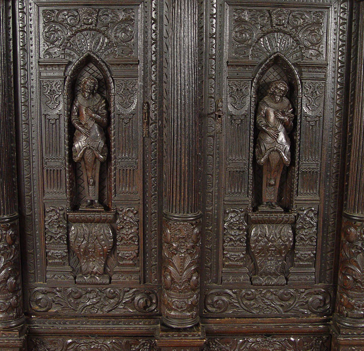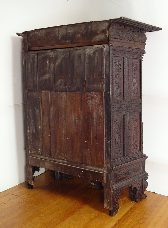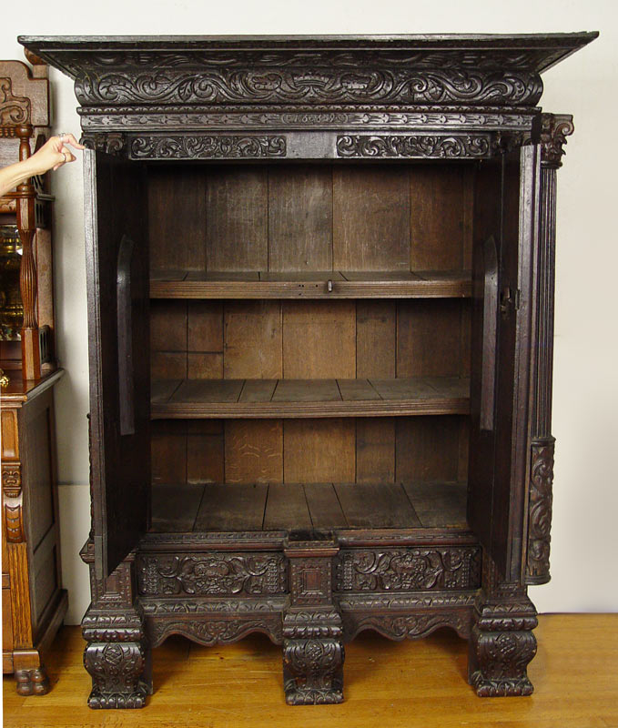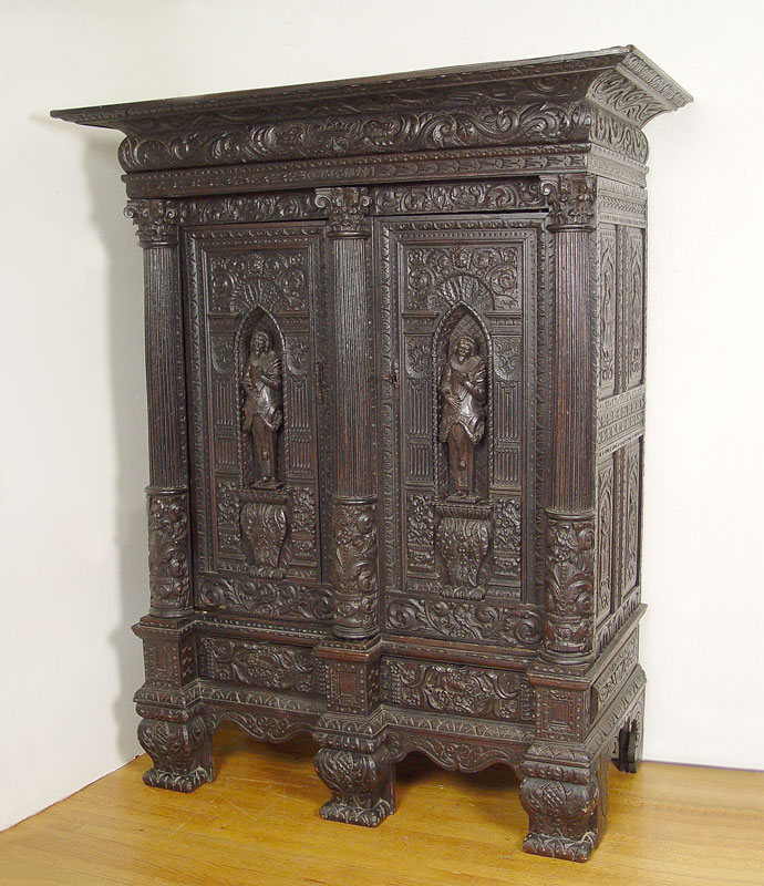 16th C HEAVILY CARVED BLACK WALNUT COURT CUPBOARD: Double door with full figural carvings set in Gothic cove. Fluted half columns with carved capitols. Carved paneled sides and broad overhead cornice. 73 1/2'' h. x 59 1/2'' x 30''.