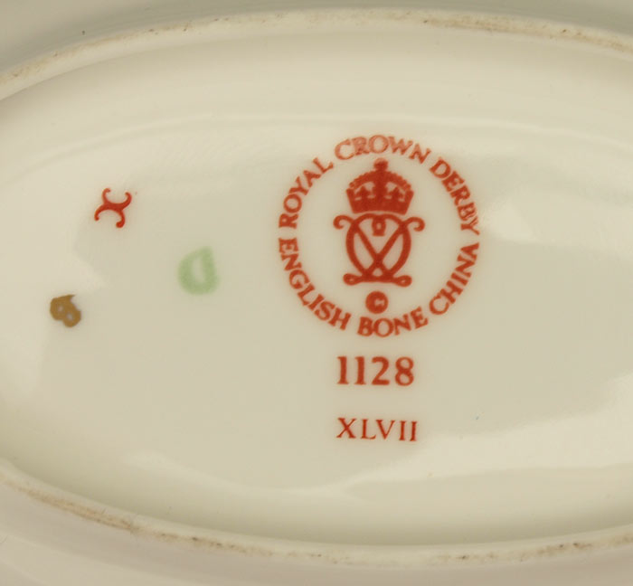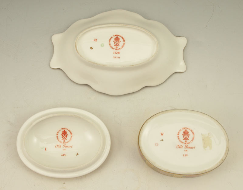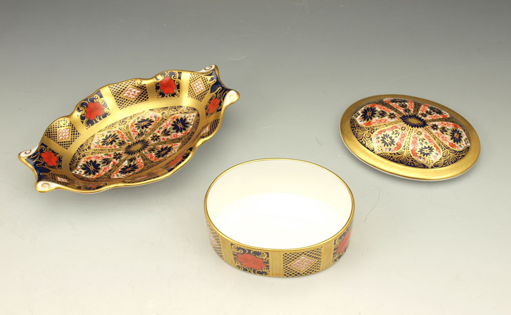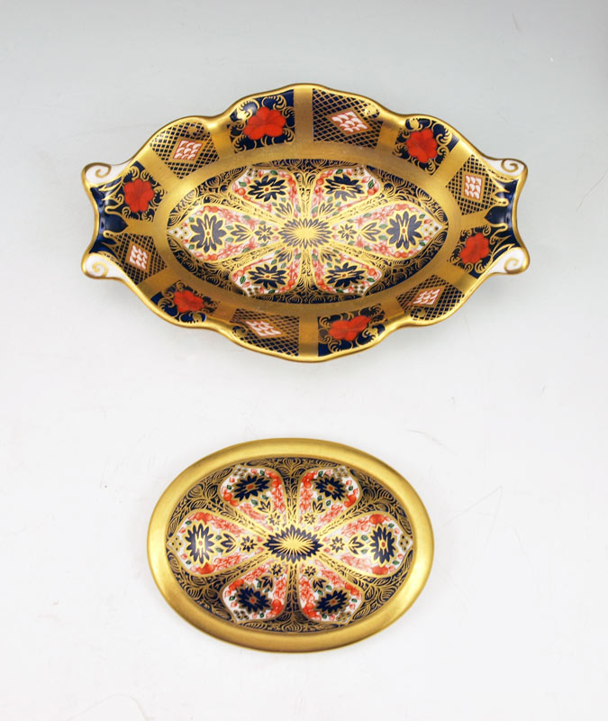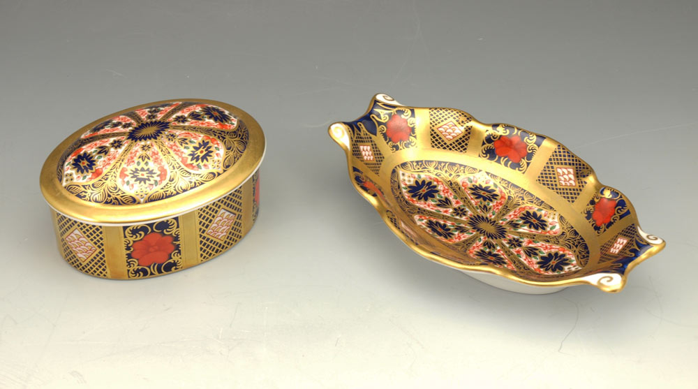 ROYAL CROWN DERBY OLD IMARI 1128: 2 pieces to include 1) A Ca. 1954 covered jar, 2''h. x 3 1/4''. 2) A Ca. 1947 small dish, 5 1/2''l.