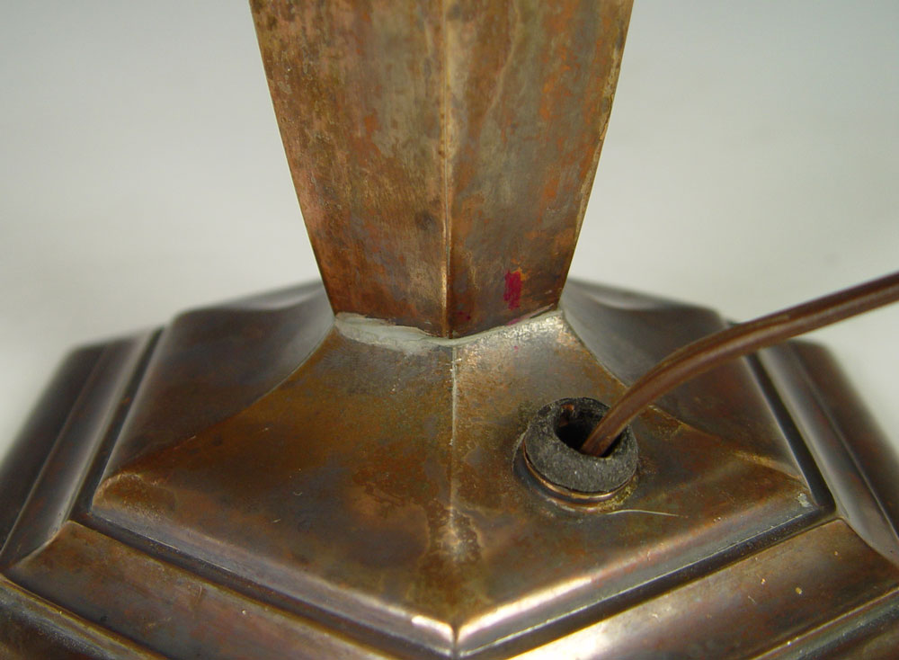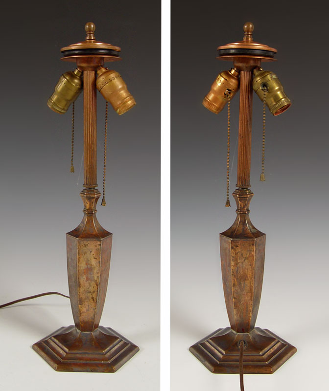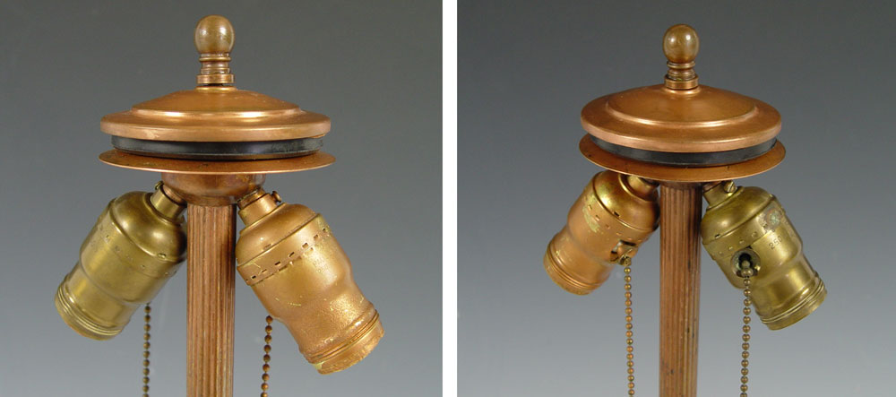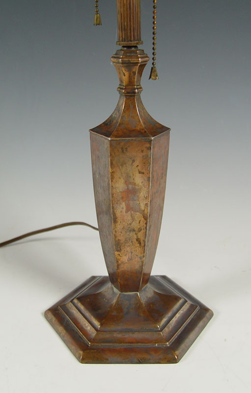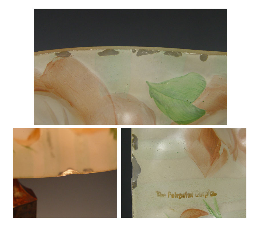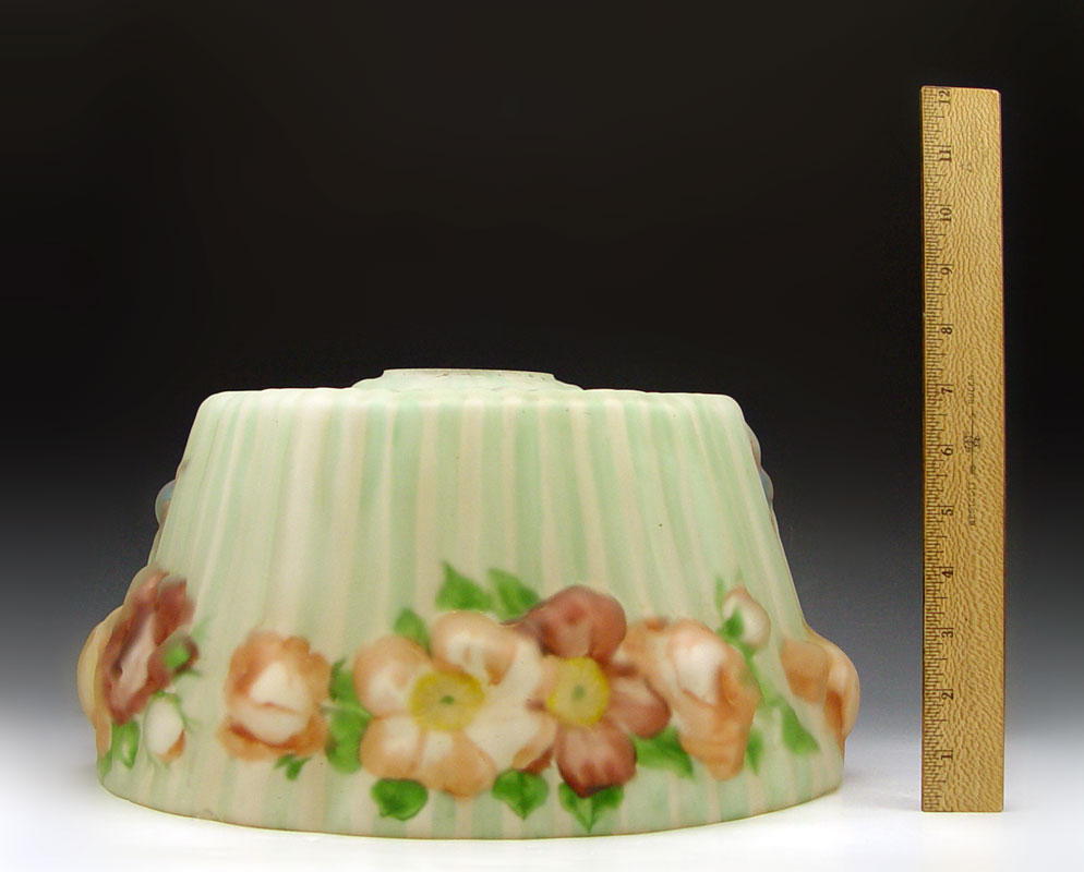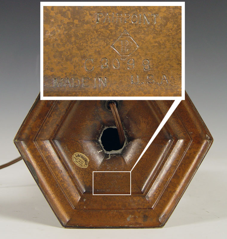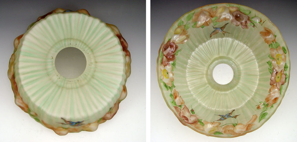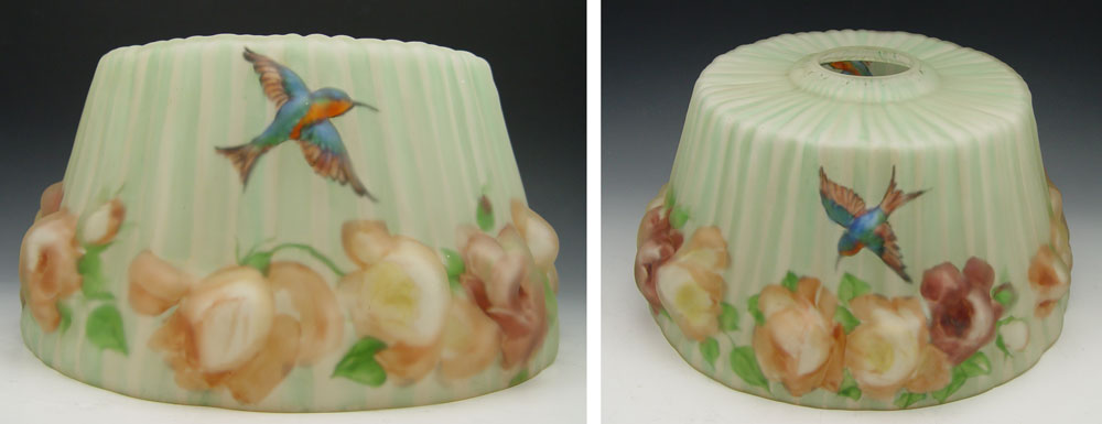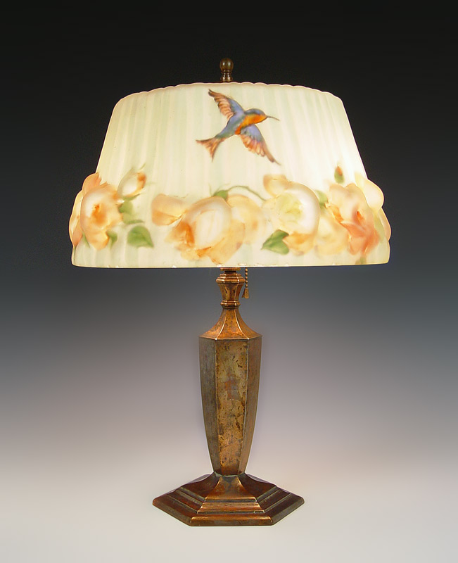 PAIRPOINT PUFFY REVERSE PAINTED ROSES AND HUMMINGBIRD LAMP: Signed base and shade. The shade with hummingbirds hovering over a band of roses. The base is impressed C3098 along with the Pairpoint logo. Double socket, pull chains. Approx. measurements 19 1/2'' tall, the shade 13 1/2'' dia.