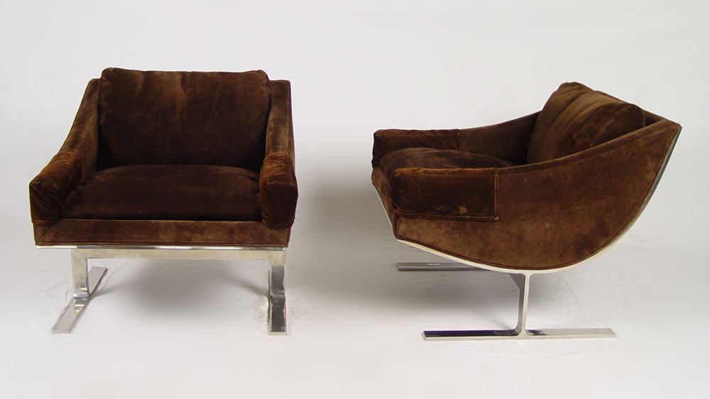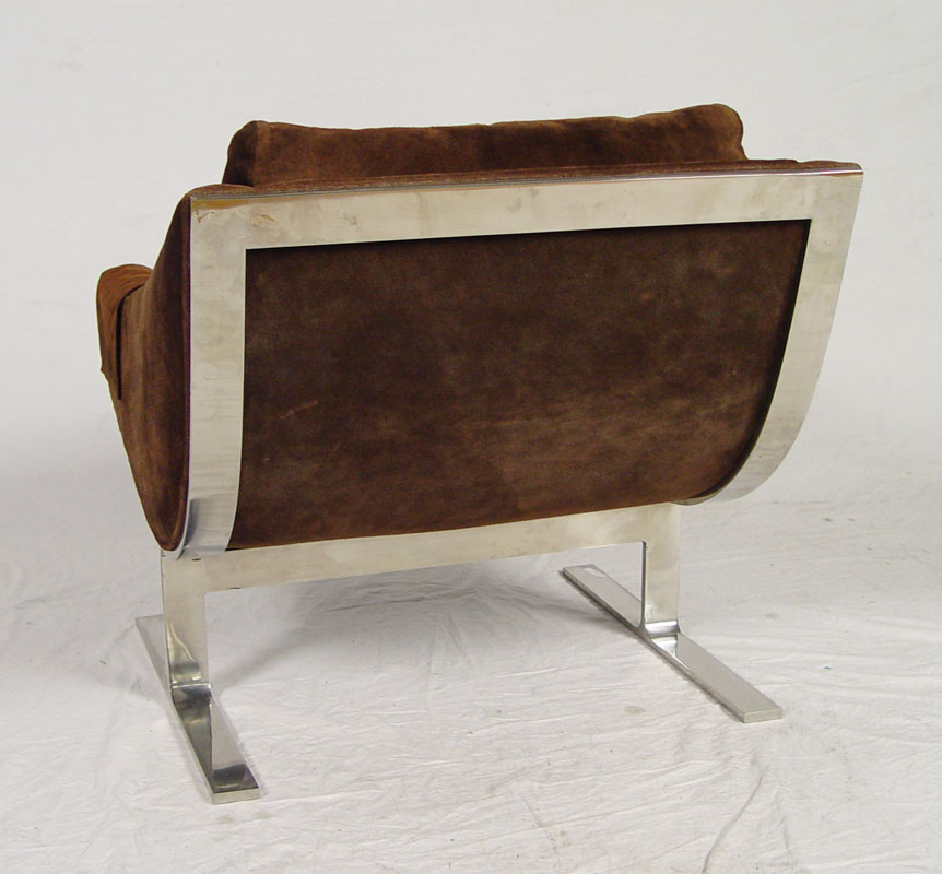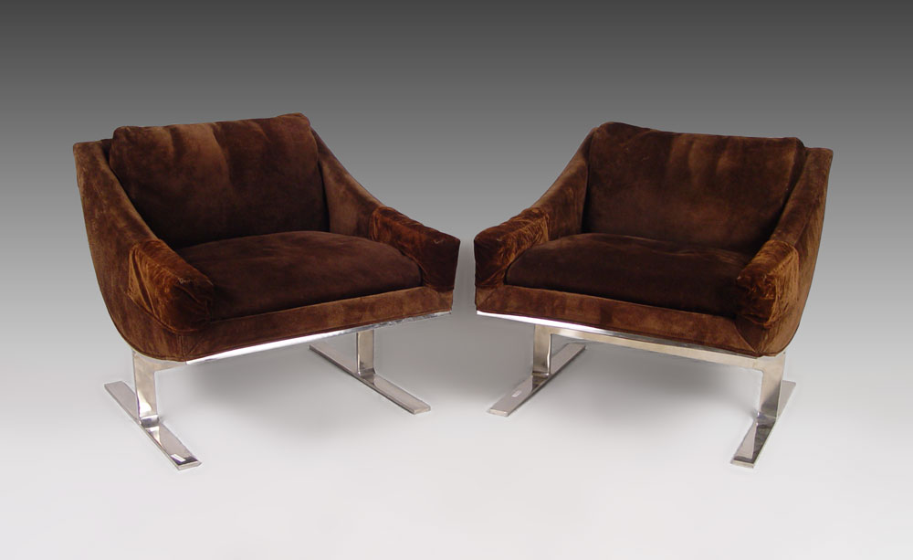 PAIR PAUL EVANS STEEL & SUEDE LOUNGE CHAIRS: Sculpted steel frames, suede upholstery. Purchased from a New York designer showroom in the late 1960's. Overall approx. 26''h. x 32''d. x 28''w.