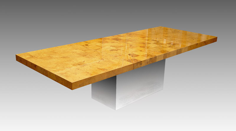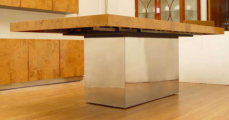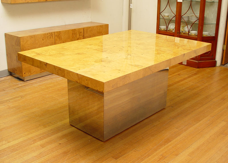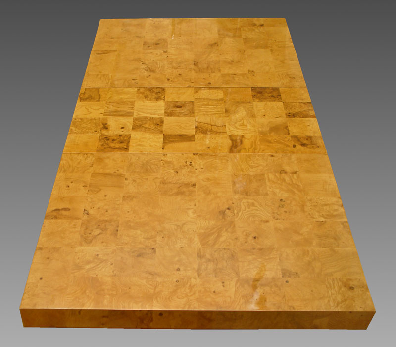 MILO BAUGHMAN THAYER COGGIN DINING TABLE: Parquetry wood top on chrome base, top is 66'' x 44'' plus 2 leaves of 22'' each.