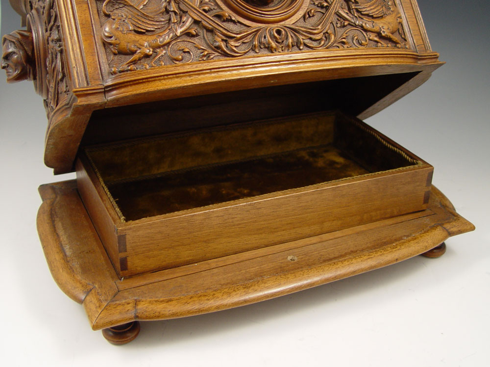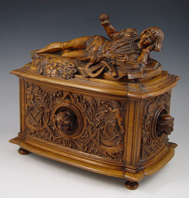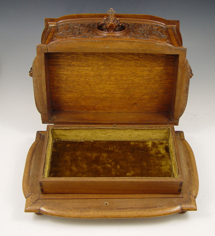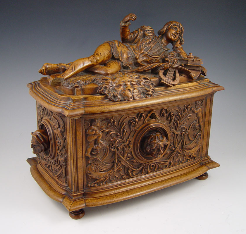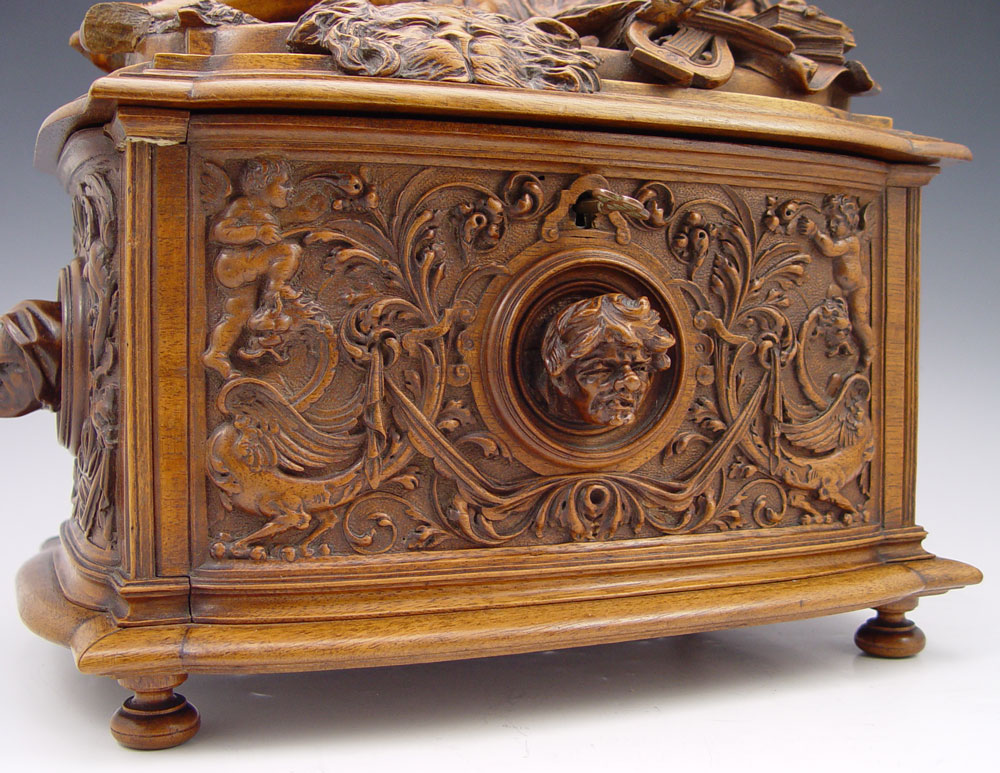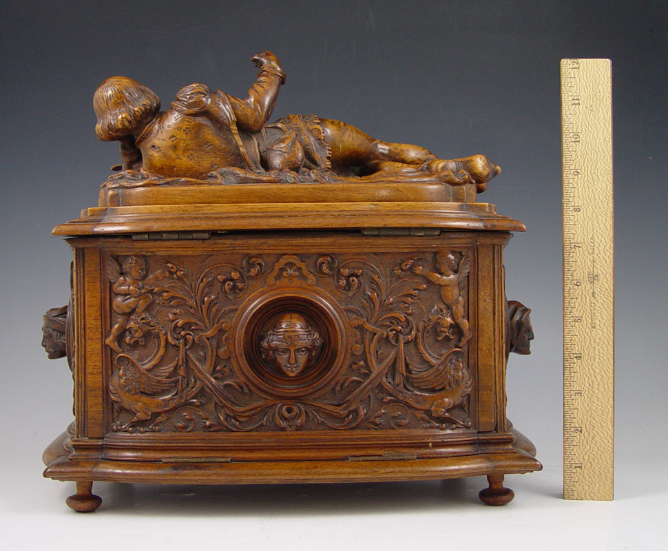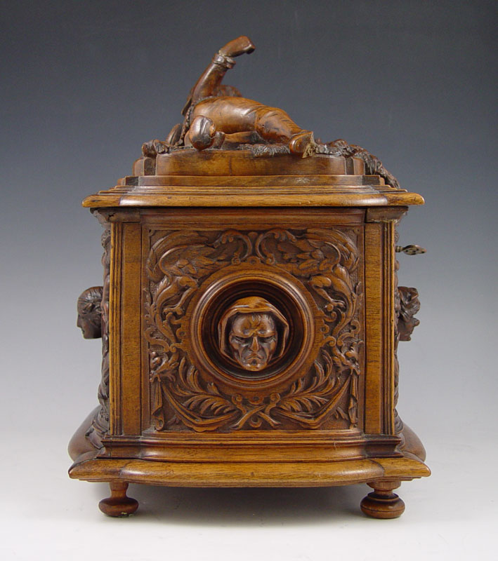 AIMONE, Victor, (Italian, 19th C.): Figural Carved Walnut Box. 12 3/4'' x 13 3/4'' x 9'', secret compartment in bottom, signed twice, dated 1886.