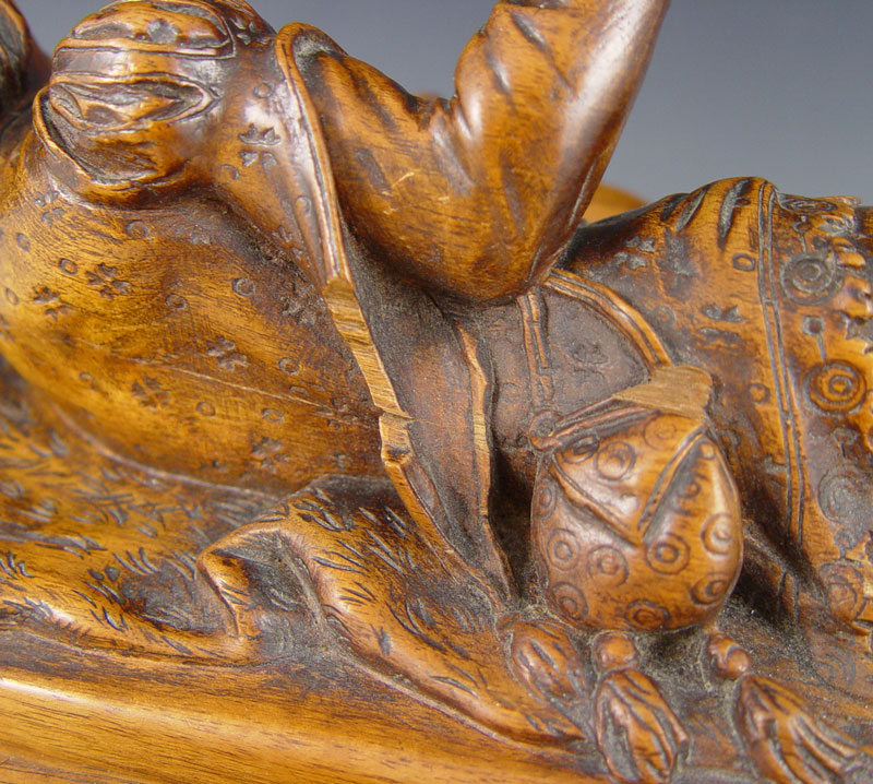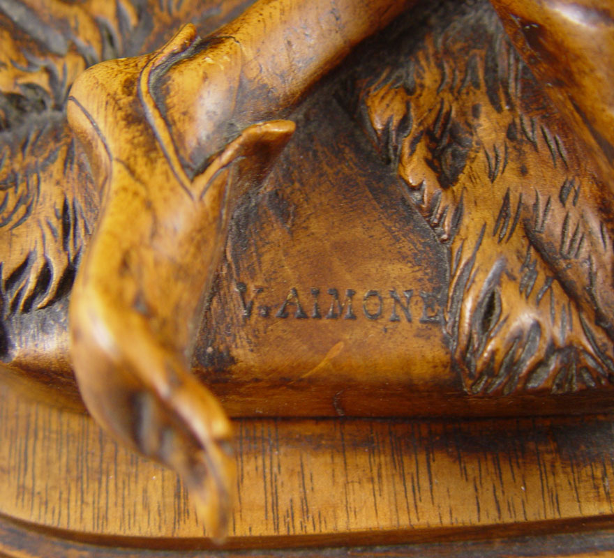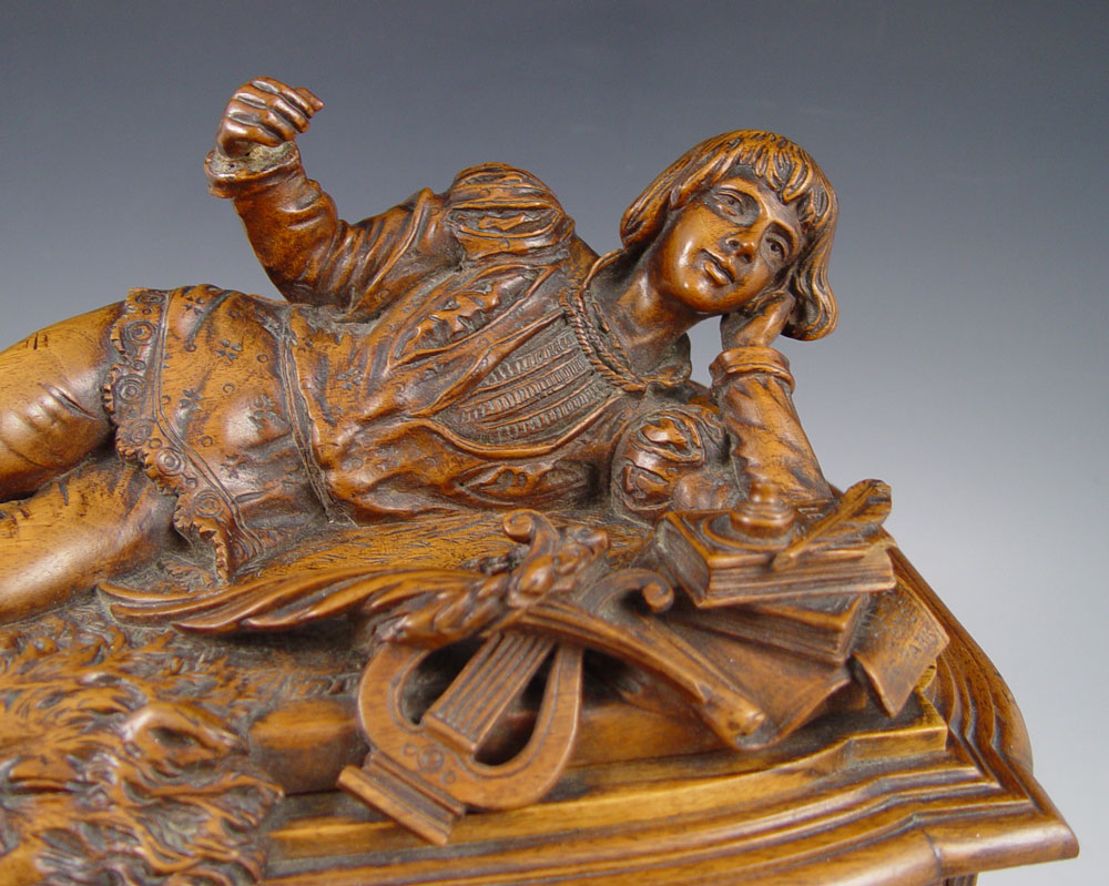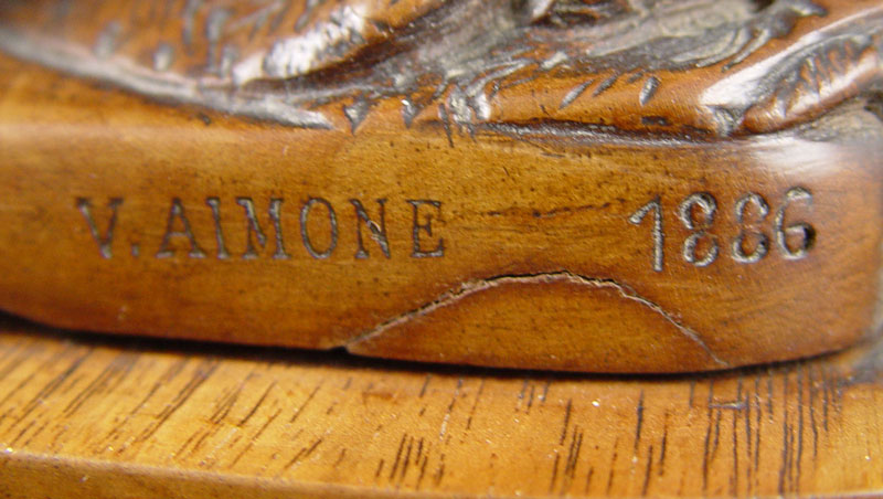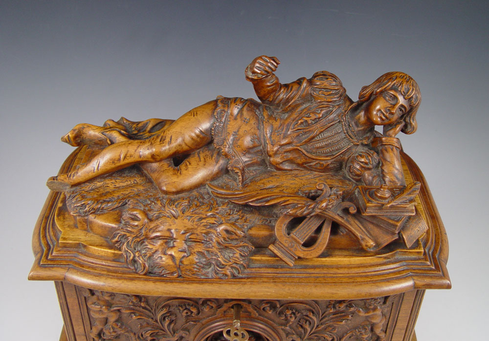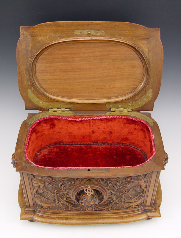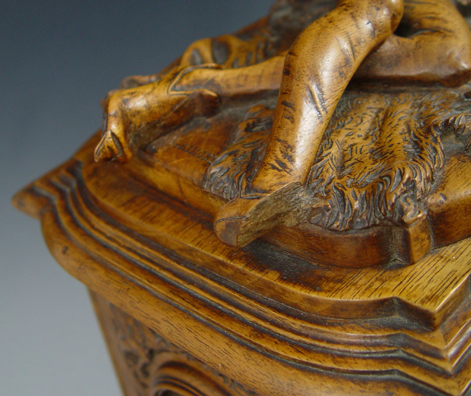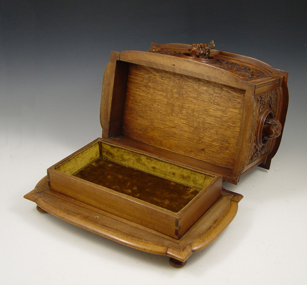AIMONE, Victor, (Italian, 19th C.): Figural Carved Walnut Box. 12 3/4'' x 13 3/4'' x 9'', secret compartment in bottom, signed twice, dated 1886.