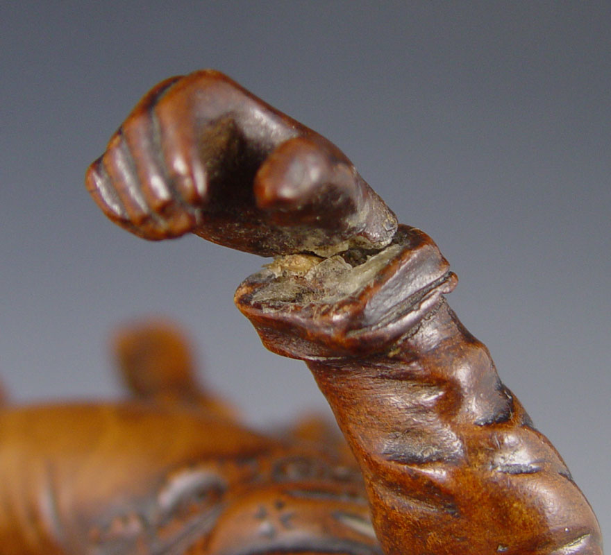 CONDITION: Repair to hand, several missing bits of wood, most notably partial foot, probably had a pen in hand.
