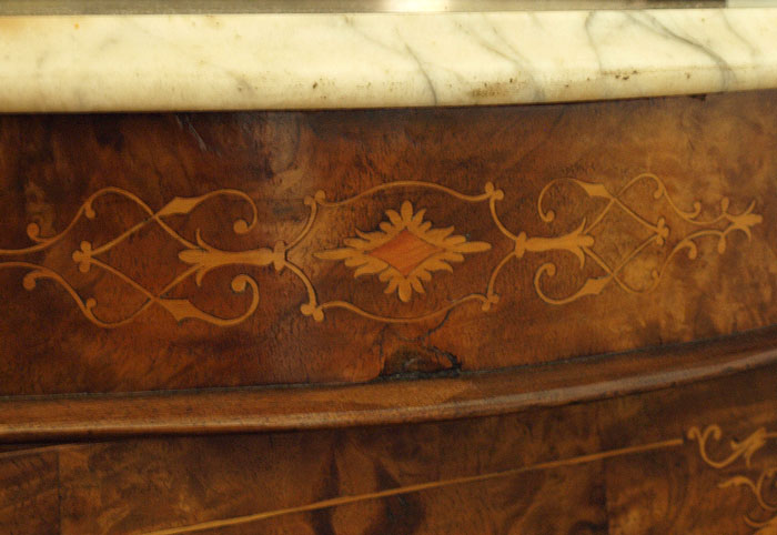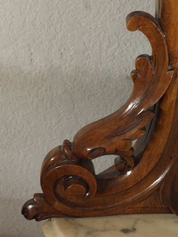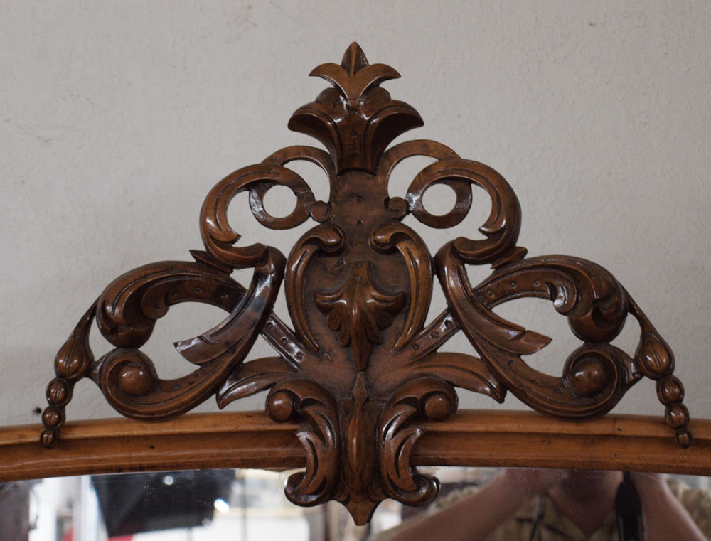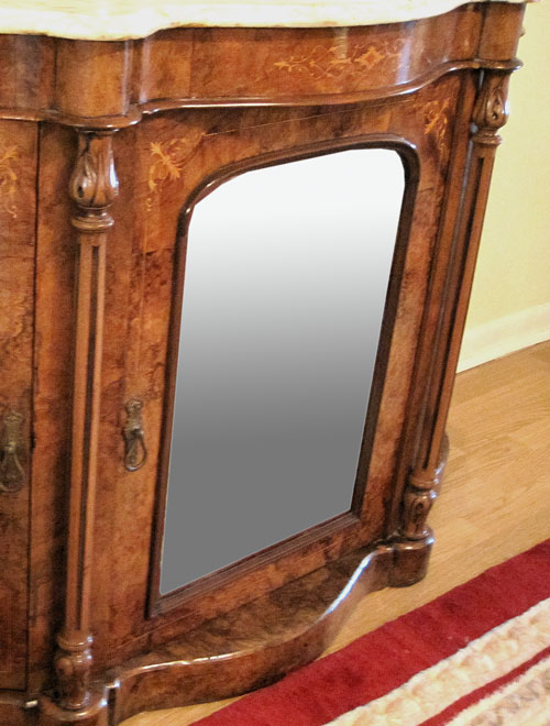 19th C BURLED MARBLE TOP SERVER: Shaped marble top under the ornately crested mirror. Serpentine front bottom cabinet with three mirrored doors. Overall approx. 76''h. x 60''w. x 17''d.