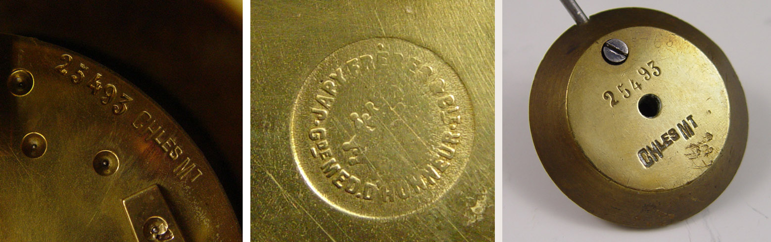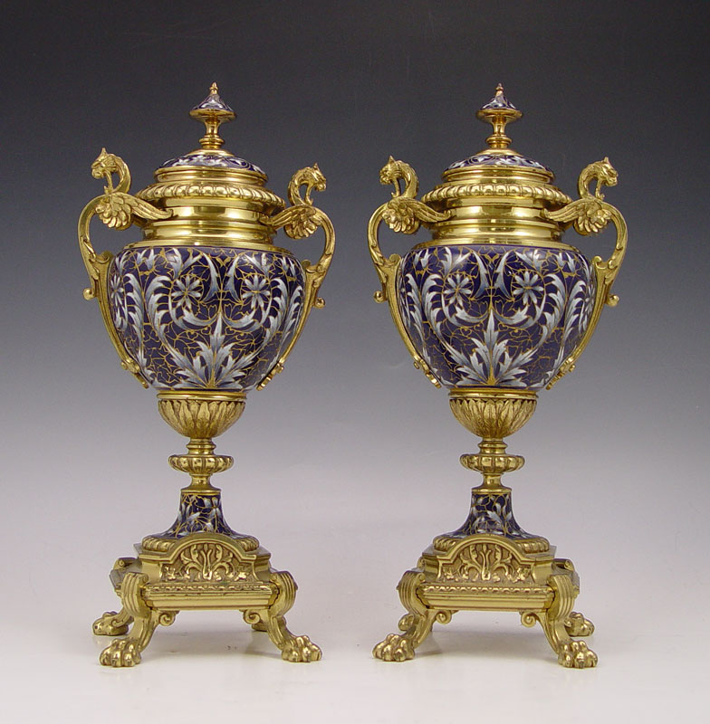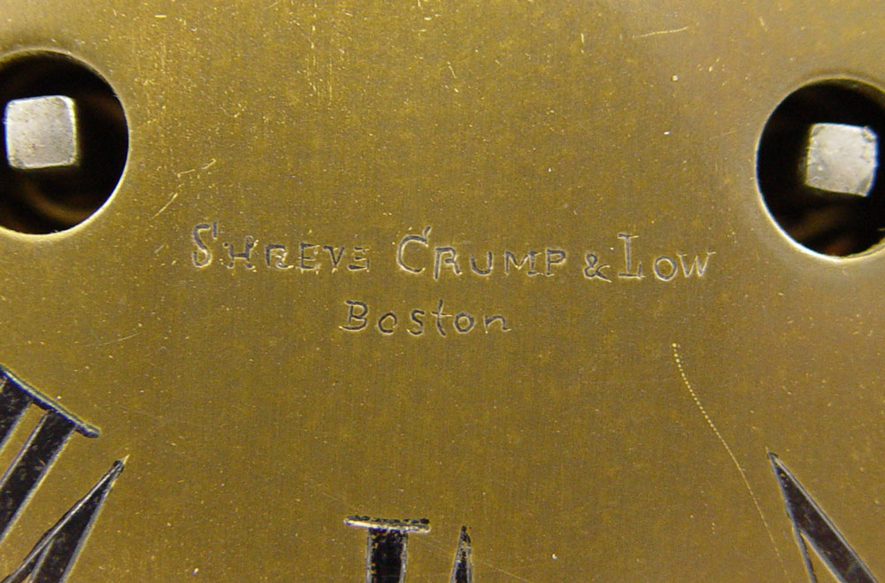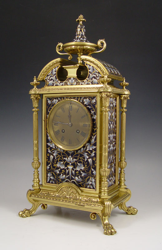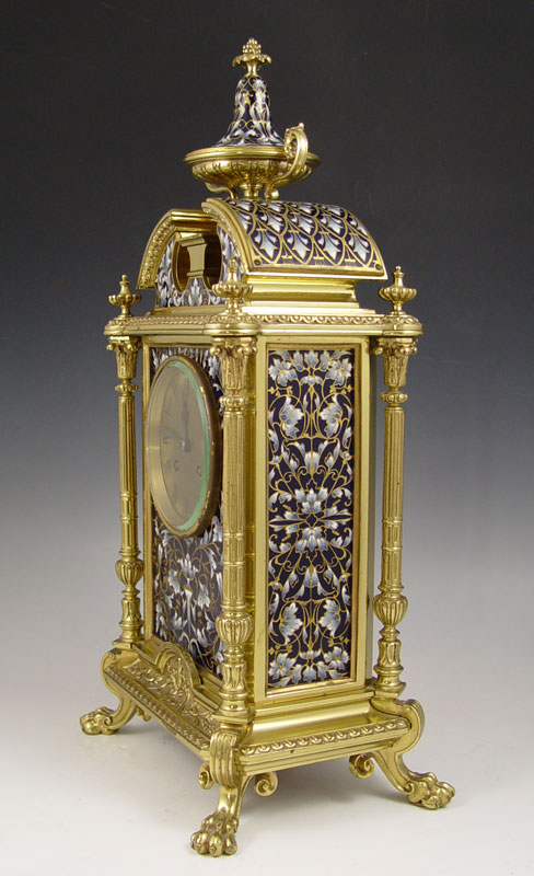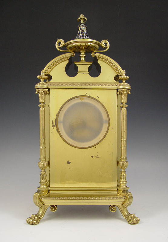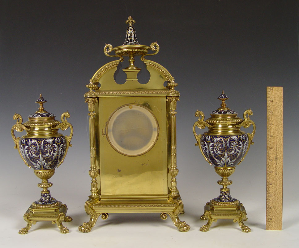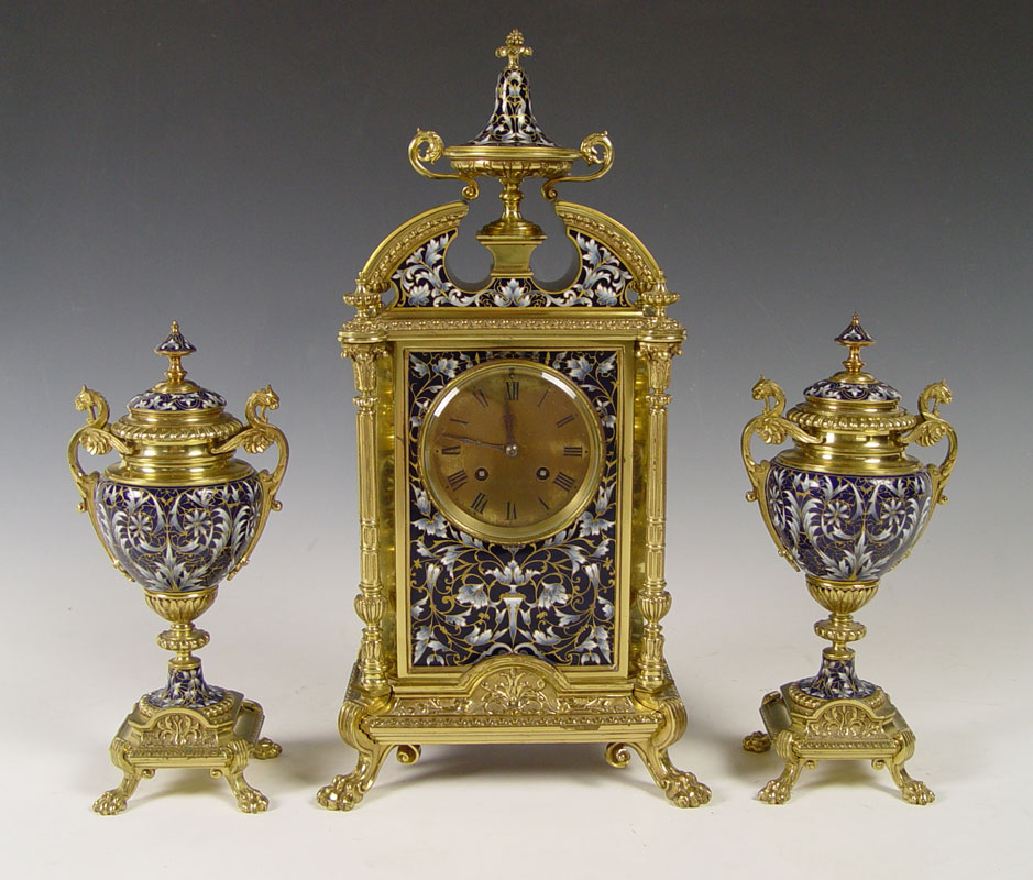 SHREVE CRUMP & LOW FRENCH ENAMEL CLOCK GARNITURE SET: Brass finish case mantle clock adorned with floral French enamel decoration, urn finial and claw feet. 4 full columns. Metal face with Roman numerals, stamped Shreve Crump & Low Boston. French Japy Freres key & pendulum movement (in office). Marked 25493 5-5 CHLES M7, ''Japy Freres Cie Medaille d'Honneur''. Sold with 2 matching garniture urns. Clock measures 18 1/2'' h. x 9 1/2'' x 7'' h., garniture 11 3/4'' h. x 5 1/2'' dia.