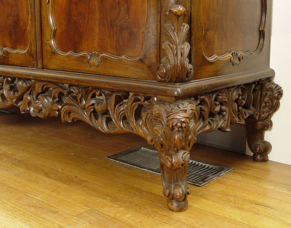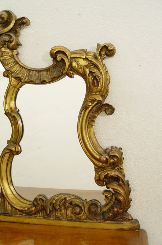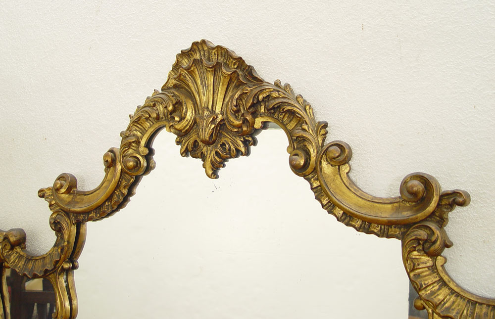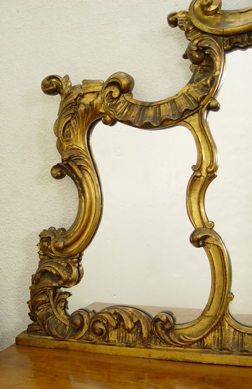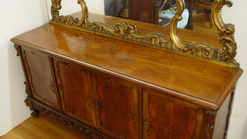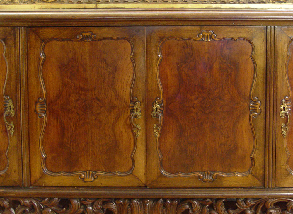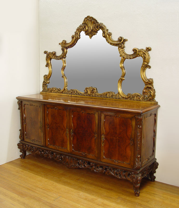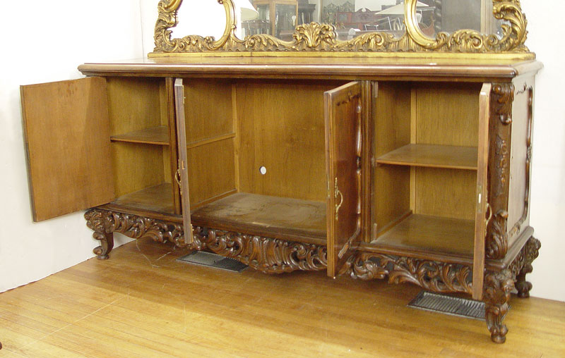 FRENCH SIDEBOARD WITH MIRROR: Four doors with carved molding, extensive carving on the skirt and feet. Sold with the gilt carved wood three part mirror. Cabinet is 39'' h. x 84'' x 22'' alone. The mirror measures 78'' length x 45'' h. Key in office.