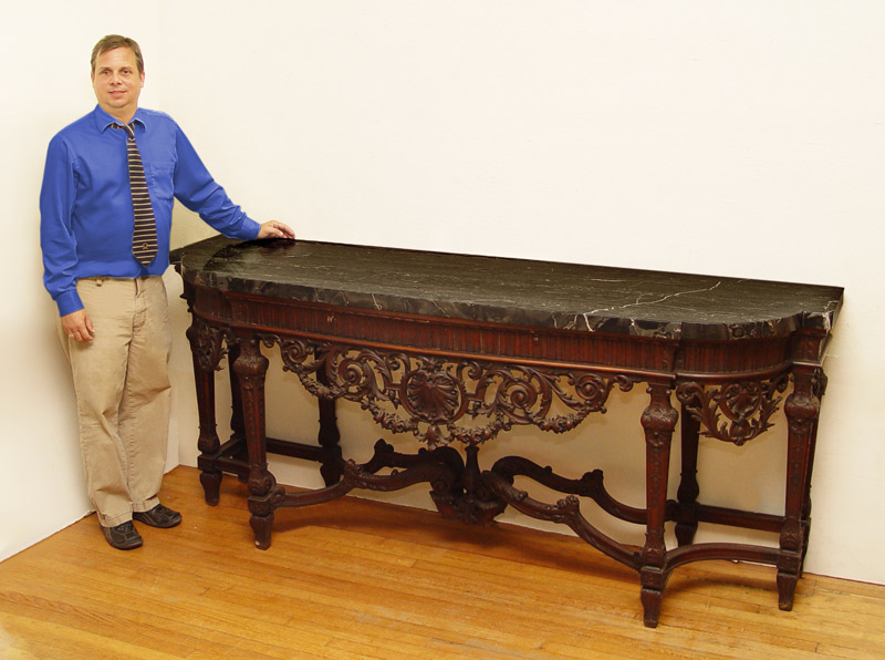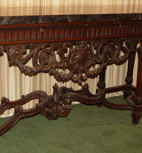 FABULOUS CARVED MAHOGANY MARBLE TOP SERVER: 2'' thick black marble over 2 half length drawers, elaborately carved skirt in floral festoons and garland, legs joined by curved stretchers. 7'5''l x 39''h x 25''.