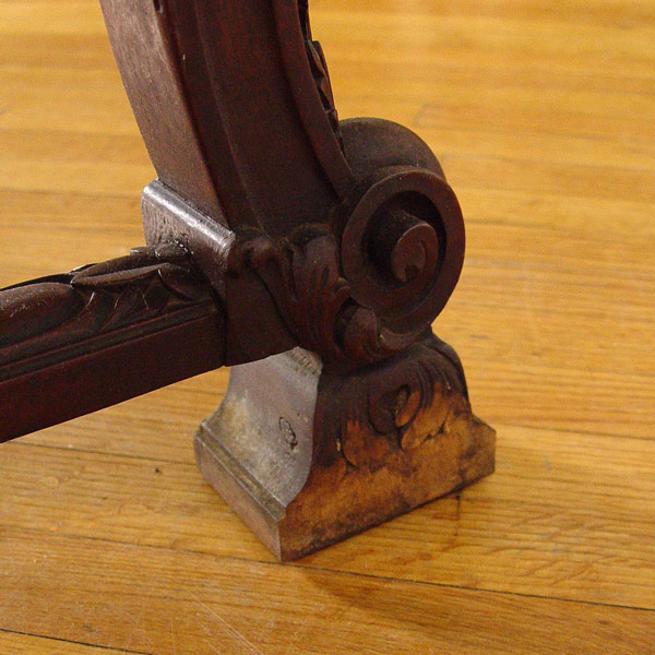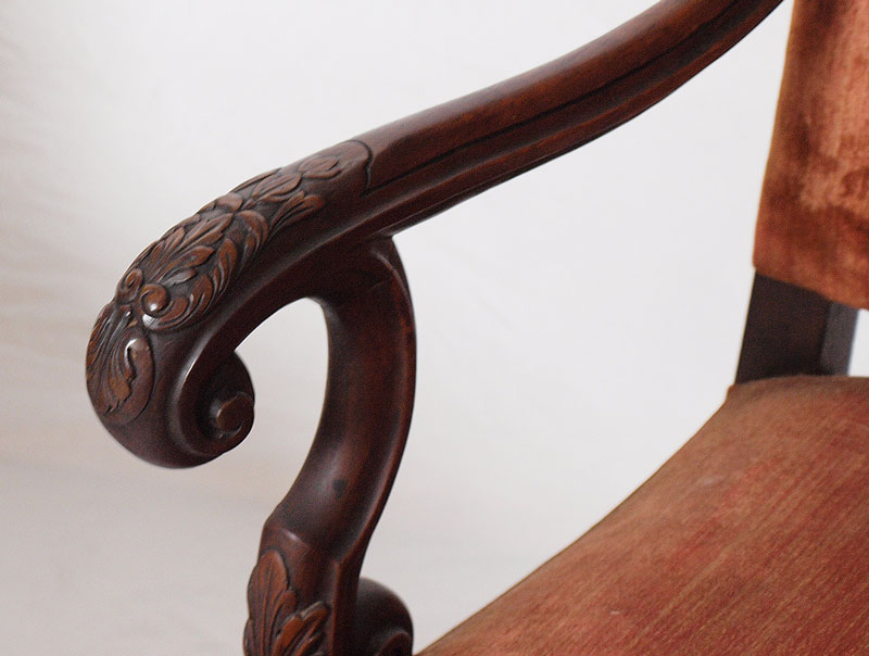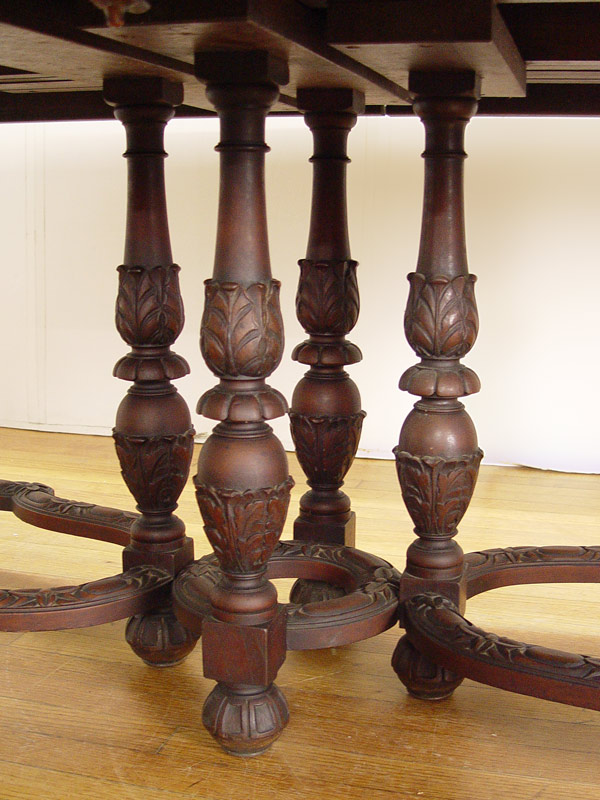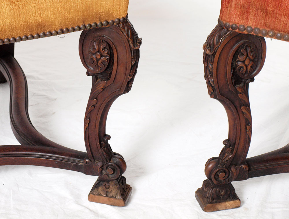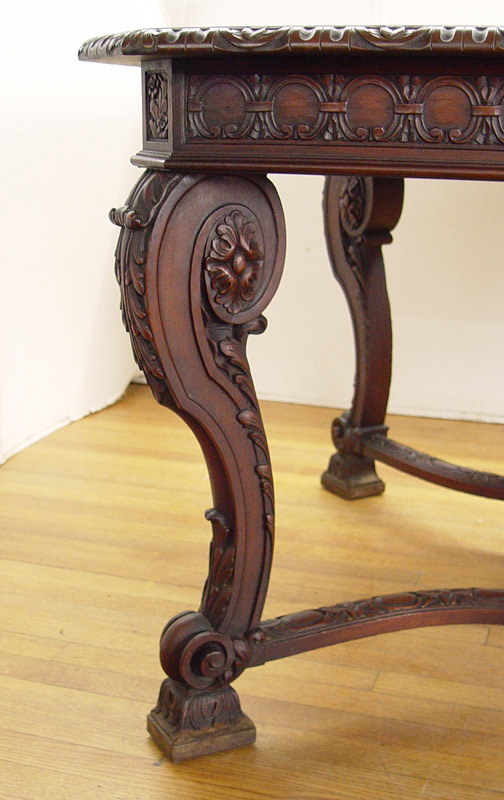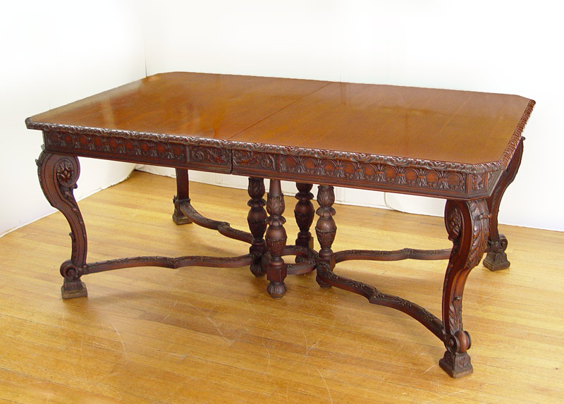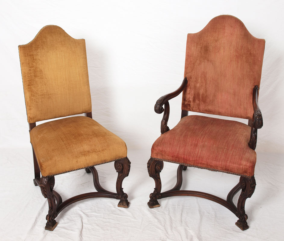 LATE 20TH C. HEAVILY CARVED ITALIAN STYLE TABLE WITH 6 UPHOLSTERED CHAIRS: The table with curved stretchers joining at a four column base. 30'' tall x 74'' wide x 46''. Two arm chairs, four side with upholstered seats and backs, 44 1/2' tall. x 24'' deep x 22'' wide.