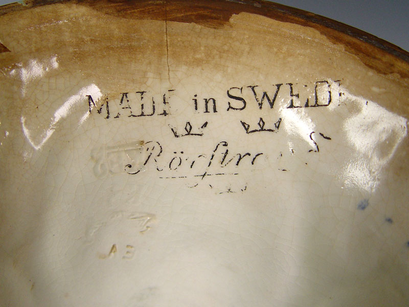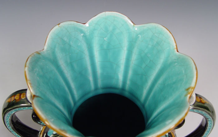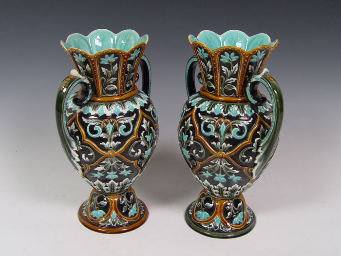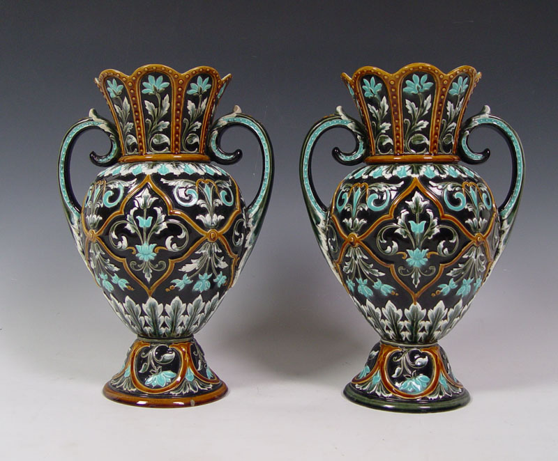 PAIR RORSRTAND SWEDISH MAJOLICA URNS: 15 1/4'' h. x 10'' dia.