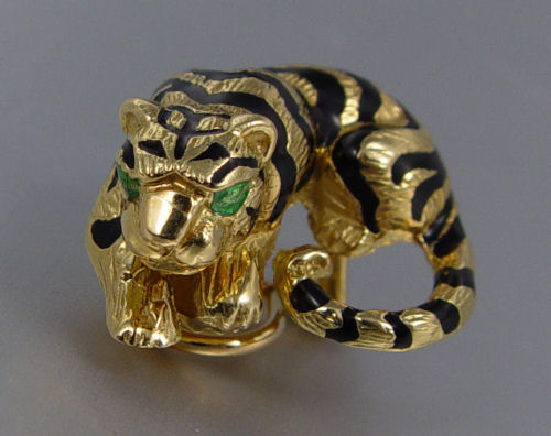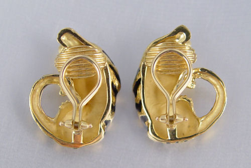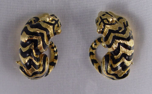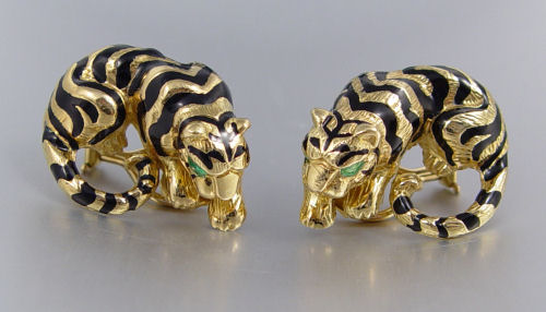 18K ENAMELED GOLD FIGURAL TIGER EARRINGS: 18K yellow gold earrings depict stylized tigers with black enamel decoration. Green enamel eyes. Hinged clip closures. Weight: 32.8 grams.