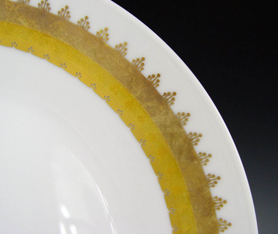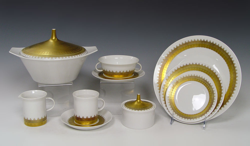 66 PIECE ROSENTHAL STUDIO LINE GOLD DECORATED CHINA SERVICE: Maharani pattern. Approx. 66 pieces to include 11 dinner plates, 11 salad plates, 10 bread plates, 10 cream soups with 10 underplates, 10 cups, 11 saucers, covered vegetable, creamer, and sugar.