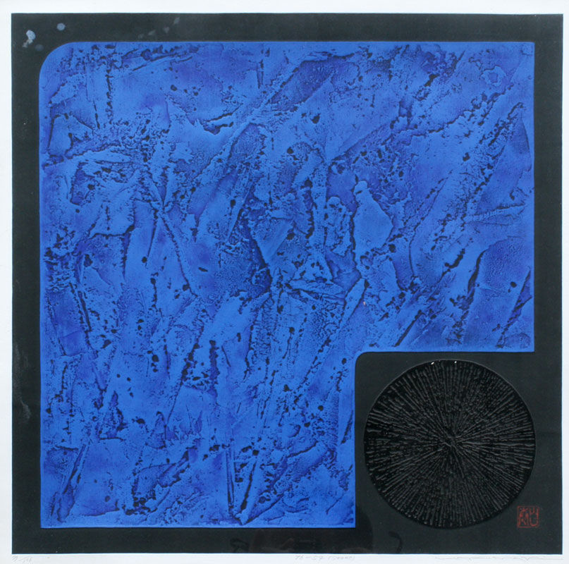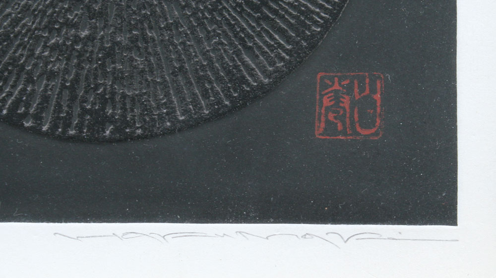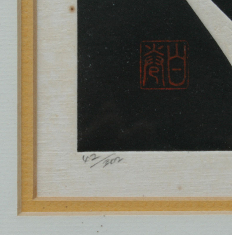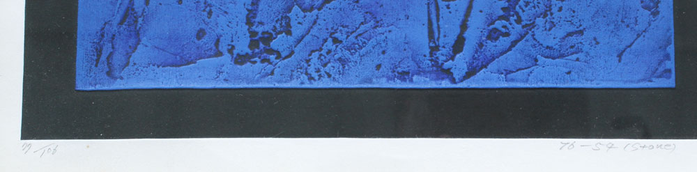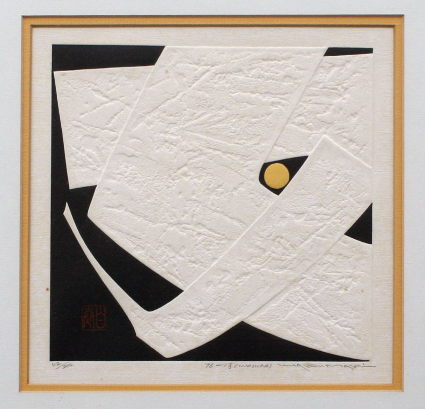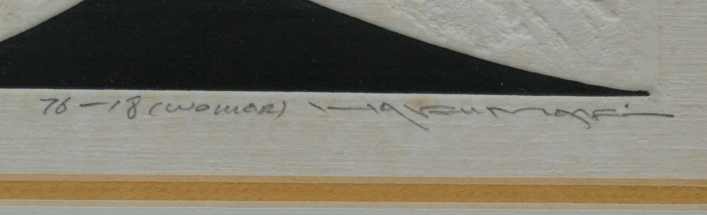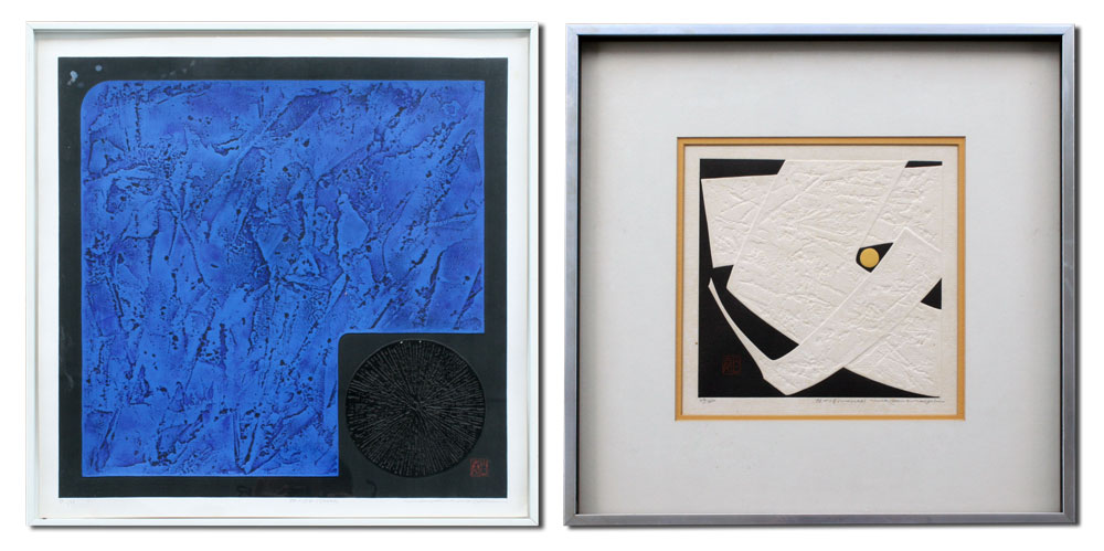 MAKI, Haku, (Japan, 1924-): 2 Pc abstract print lot, both pencil signed, framed; ''Woman'', sight size 8 3/4'' x 8 3/4'', numbered 42/202?, frame measures 16'' x 16''; ''Stone'', 17'' x 17'', numbered 79/100, frame measures, 17 3/4'' x 17 3/4''.
