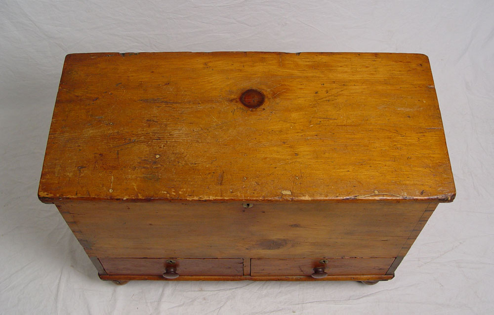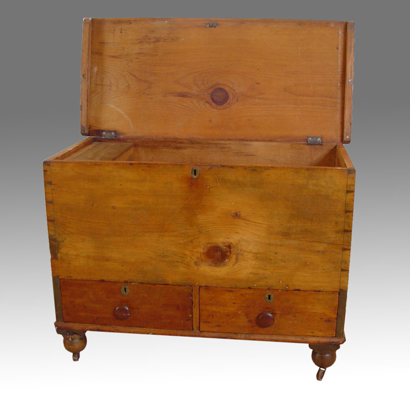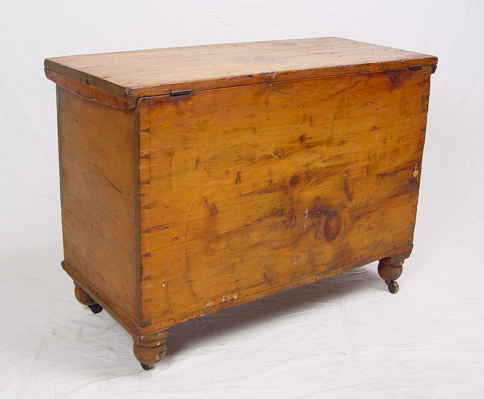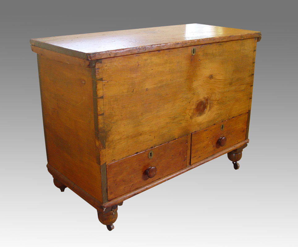 EARLY 19TH C 6 BOARD PINE BLANKET CHEST: Pennsylvania. Dovetailed construction, original locks and brass. Lift top, 2 drawers. Original bun feet with added casters. Illegible hand written note on underside. 28'' tall x 38'' wide x 17'' deep.