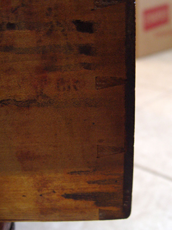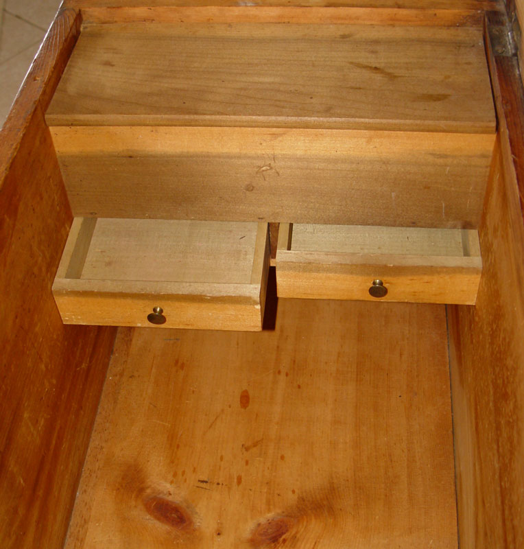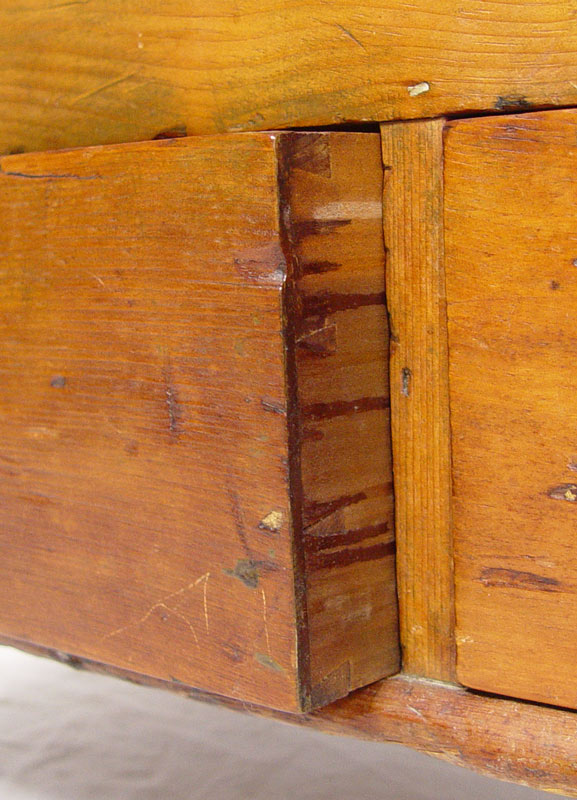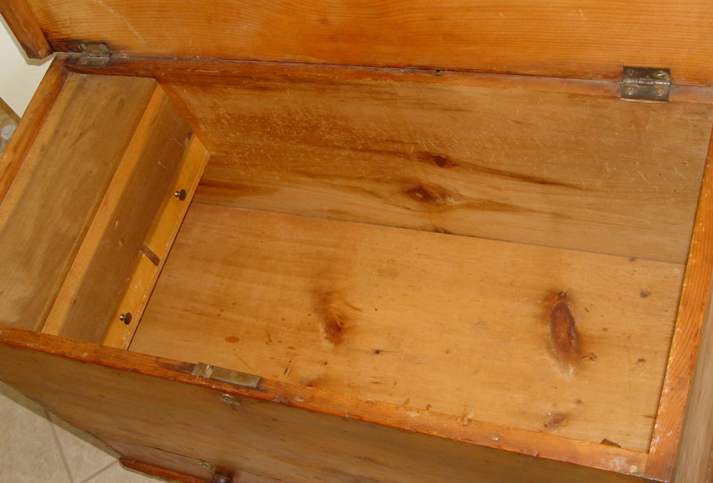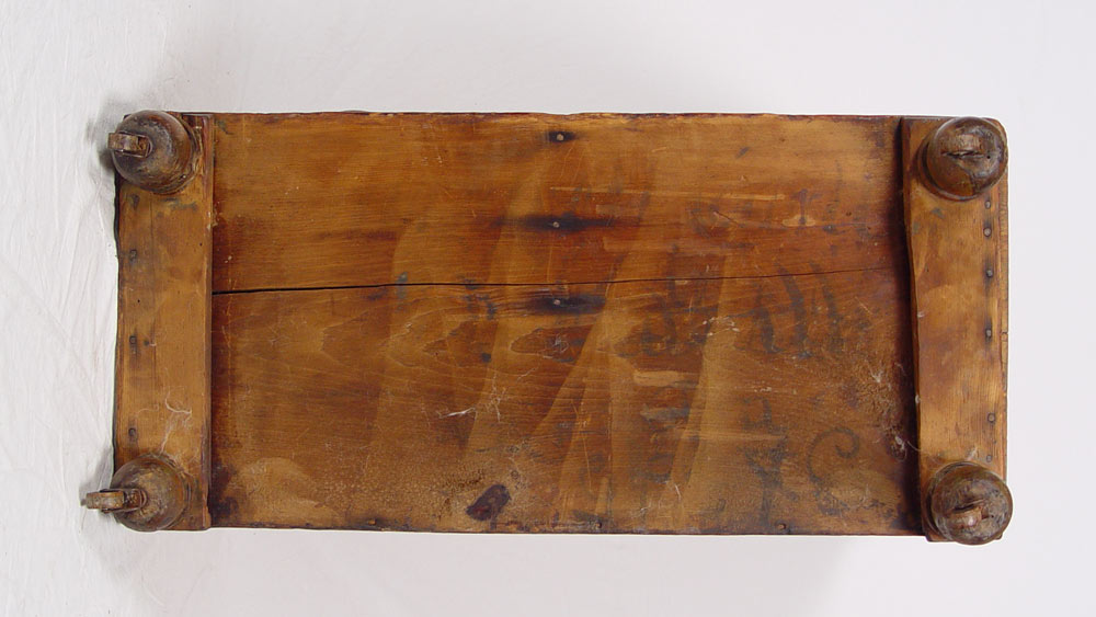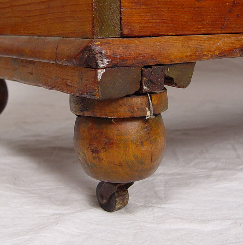 EARLY 19TH C 6 BOARD PINE BLANKET CHEST: Pennsylvania. Dovetailed construction, original locks and brass. Lift top, 2 drawers. Original bun feet with added casters. Illegible hand written note on underside. 28'' tall x 38'' wide x 17'' deep.