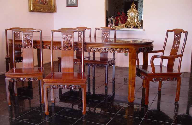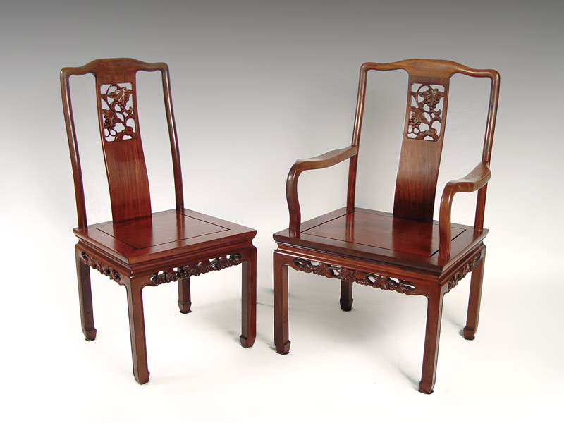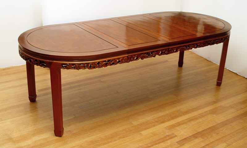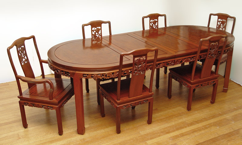CHINESE STYLE DINING TABLE & 6 CHAIRS: Chinese style oval table, 30'' h. x 95 3/4'' x 41 7/8'', with 2 leaves, 17 7/8'' each. Pierce carved apron. The chairs are plank seat with grape design pierce carved slat and skirt. One arm chair, 6 side chairs.