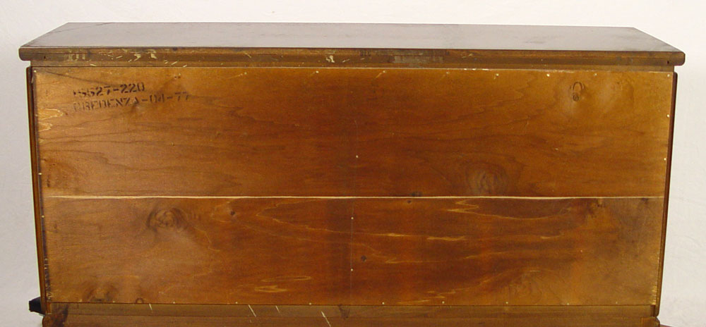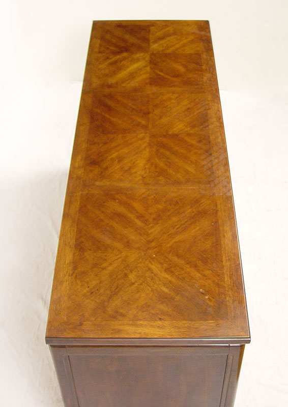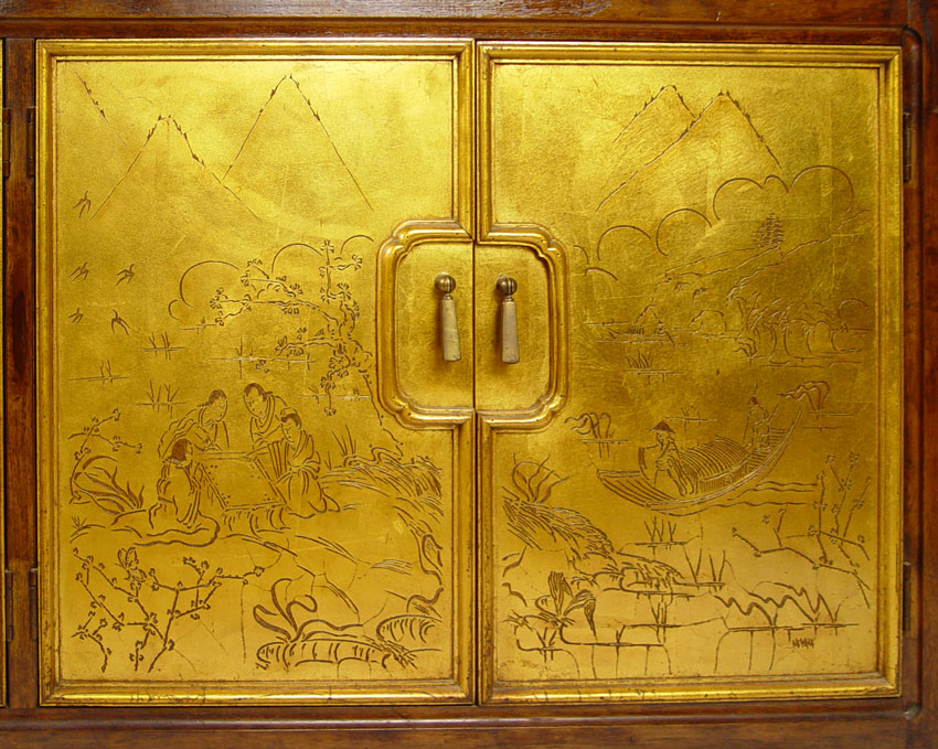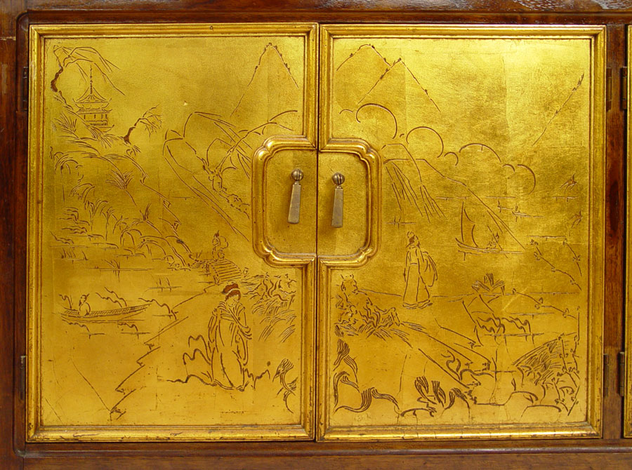 THOMASVILLE SIDE CABINET FROM THE MYSTIQUE COLLECTION: Four door, one half with drawers, the other shelves. Incised Asian theme on gold ground. Approx. 30 7/8'' h. x 60 1/4'' x 19 1/4''