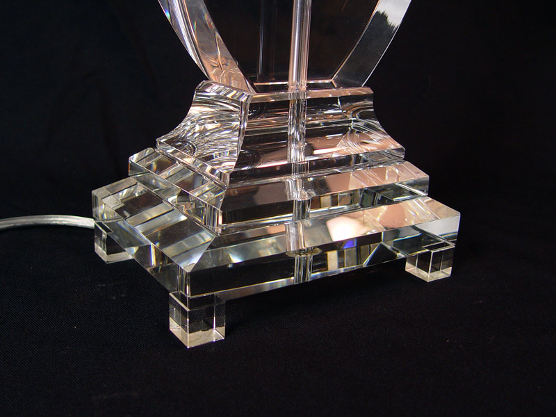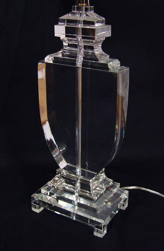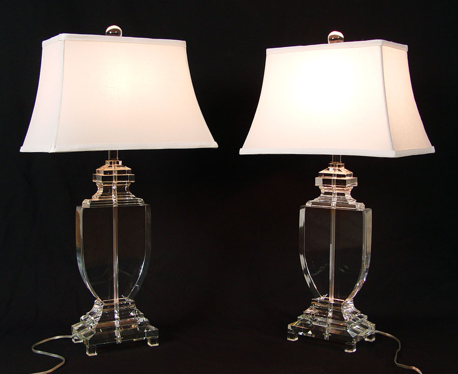 DECORATIVE GLASS TABLE LAMPS: Vase form , glass finials, white linen shades. 30'' tall overall, glass is 18''.