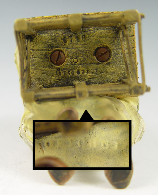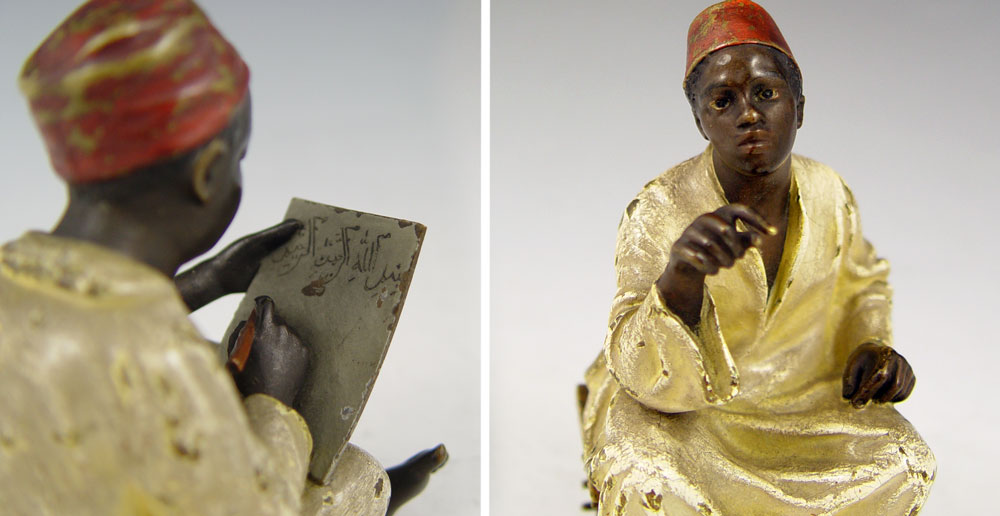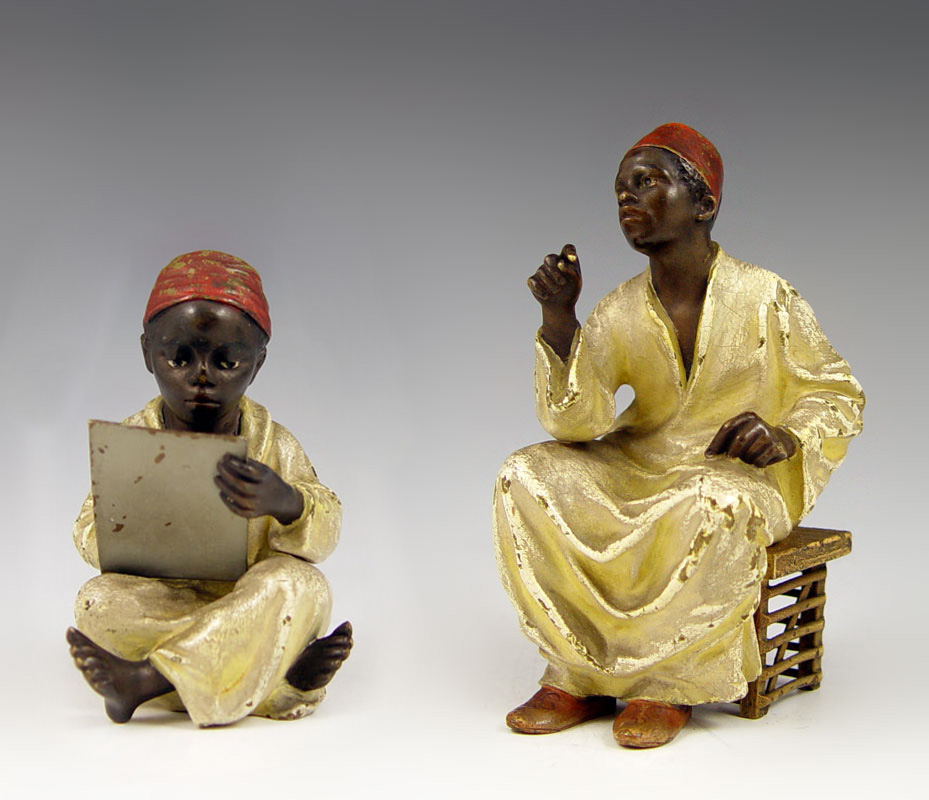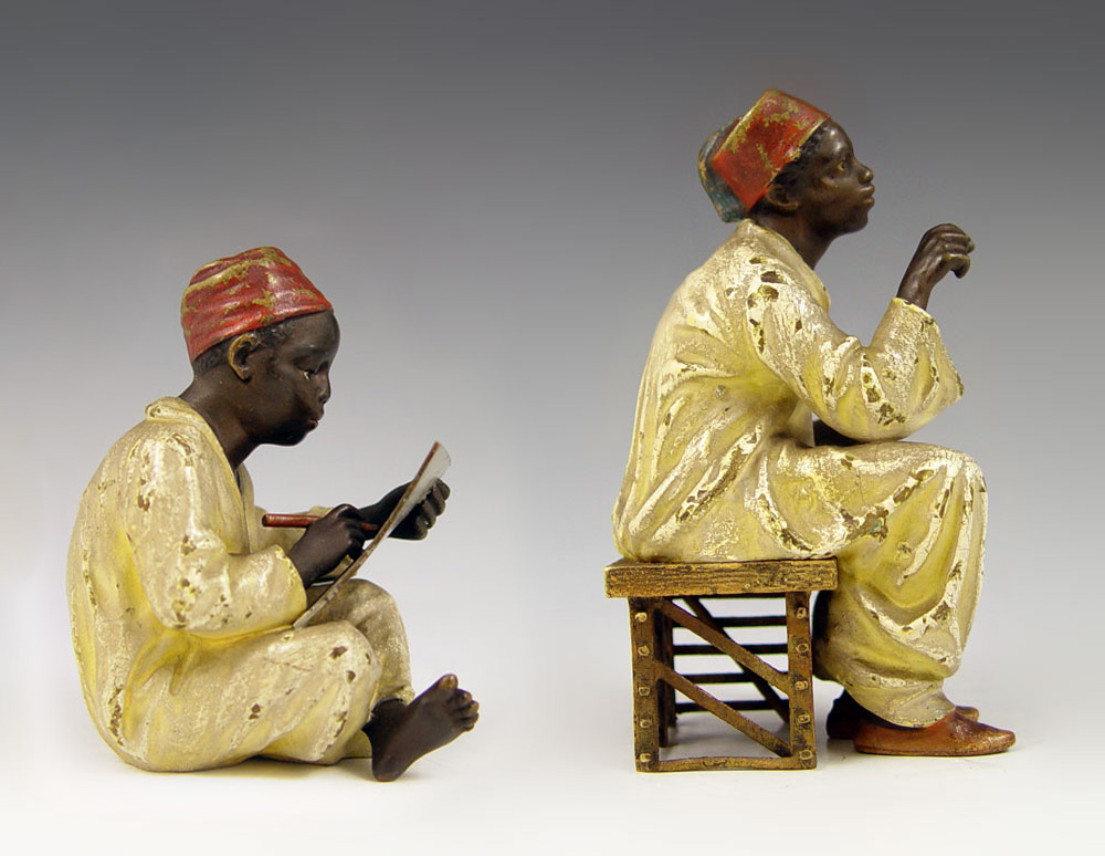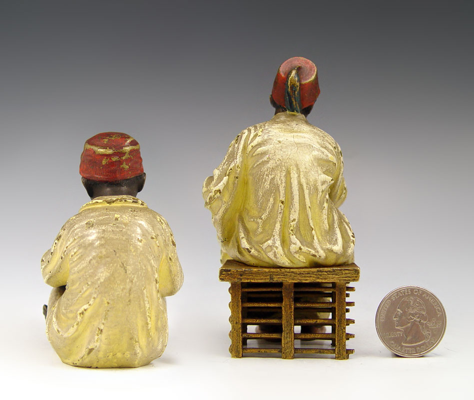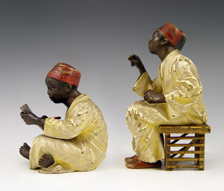 TWO BERGMAN AUSTRIAN BRONZE ORIENTALIST FIGURES: Franz Xavier Bergman (1861-1936). Cold painted bronze figures of student and teacher. 3 1/4'' and 4 1/2'' tall. Impressed B in vase mark.