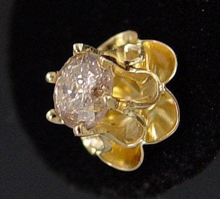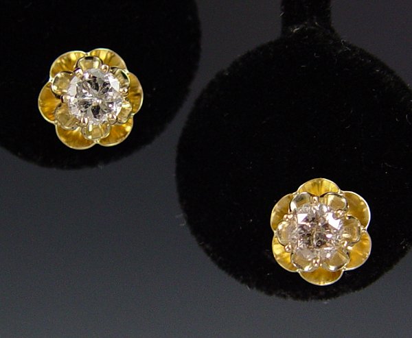14K .95 CT. OLD EUROPEAN CUT DIAMOND EARRINGS: 14K yellow gold Buttercup solitaire stud earrings contains two old European round cut diamonds. Weight: .95 Ct. Approx. The diamonds average SI-I1 in clarity and I-J in color. The diamonds are prong set. Post and nut closures. Weight: 1.5 grams.
