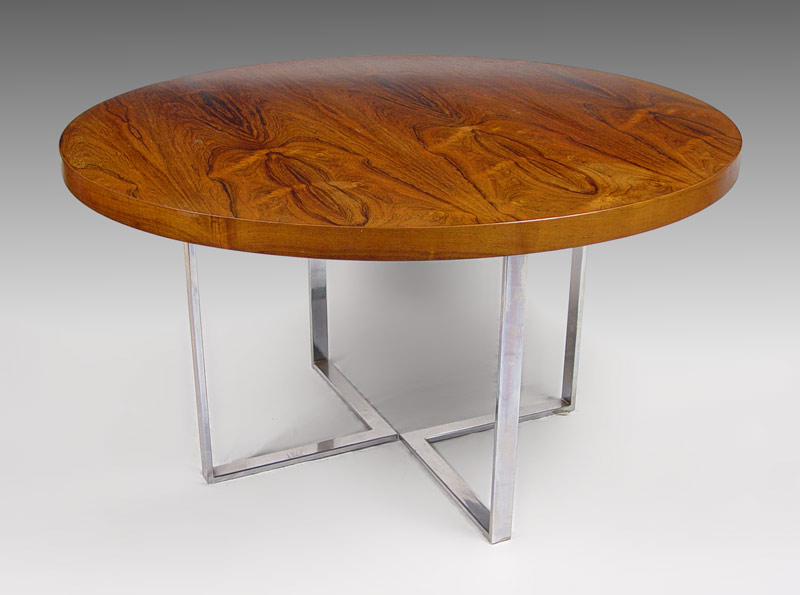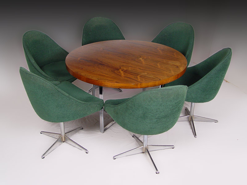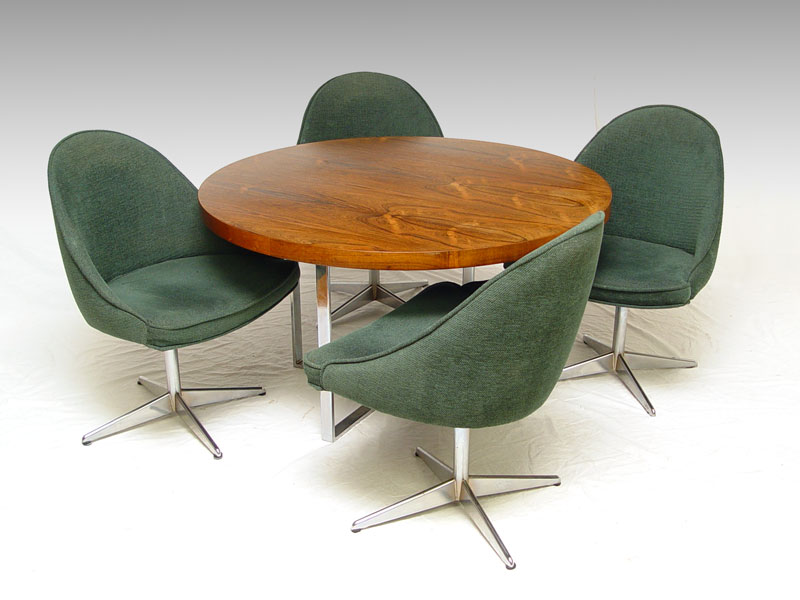 MID CENTURY ROSEWOOD TOP TABLE AND SWIVEL CHAIRS: Round wood table with glass cover on chrome base, 25 1/4''h. x 45''dia. Four swivel chairs in green fabric upholstery on chrome bases, 31''h. x 22''w. x 18''d.