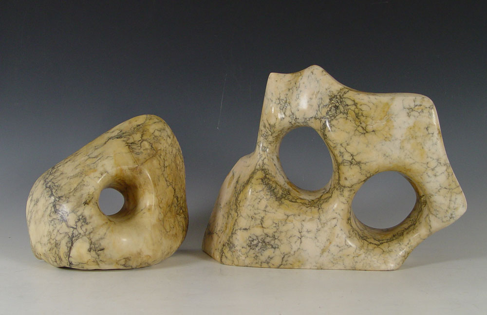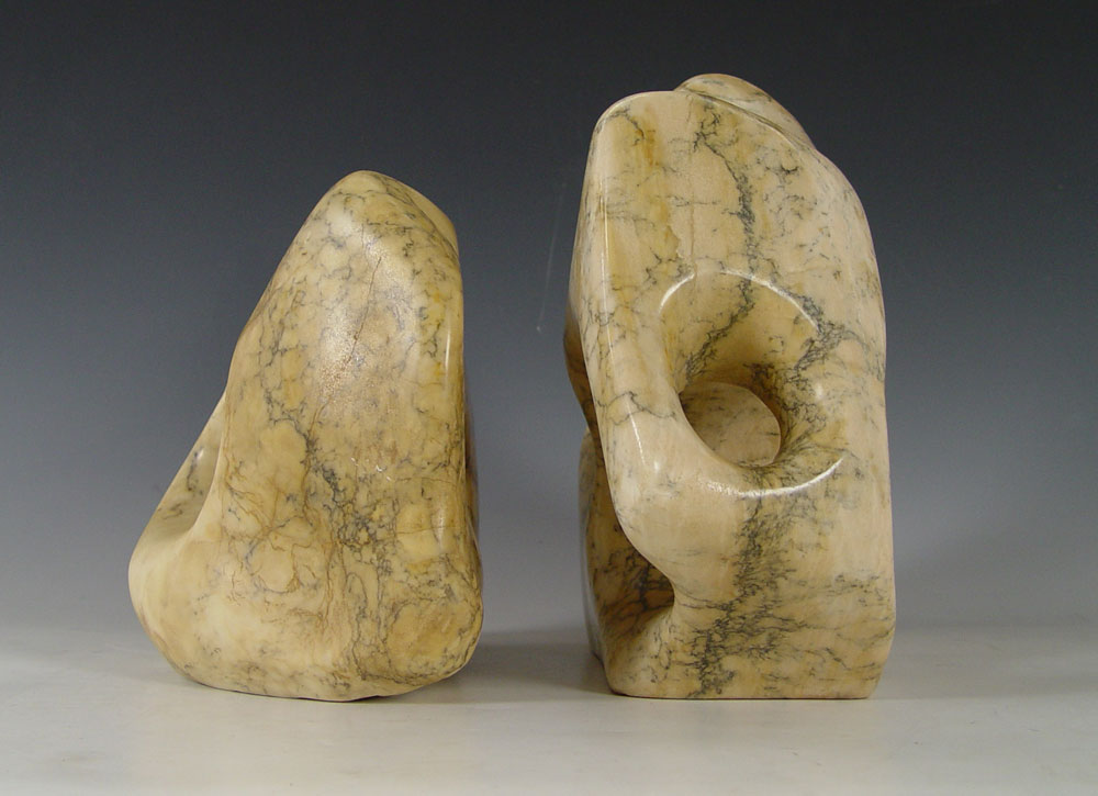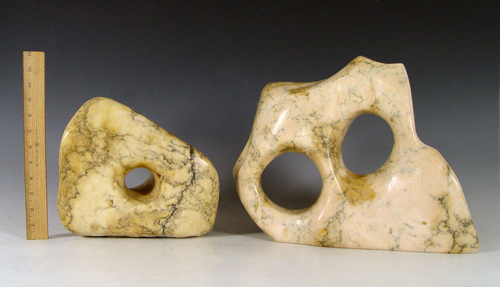 2 ABSTRACT STONE SCULPTURES: Polished marble abstracts, 9''h. x 10'' x 6 3/4'' and 12''h. x 18'' x 6''.