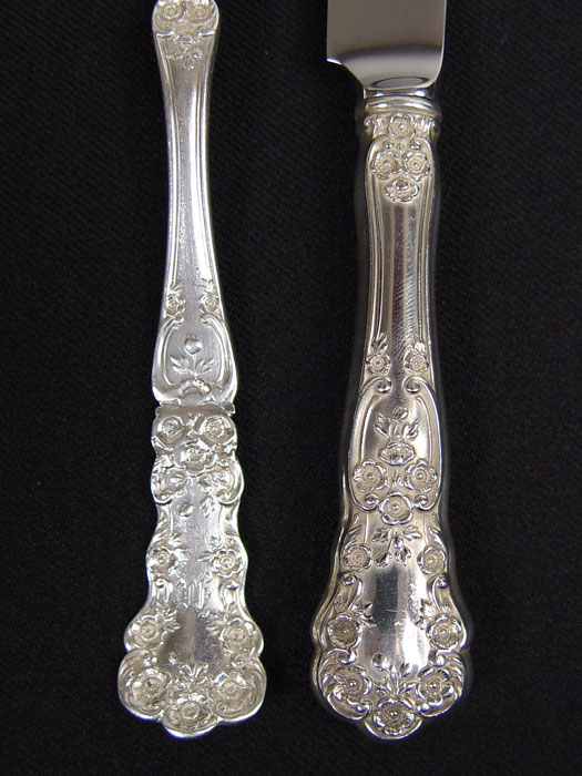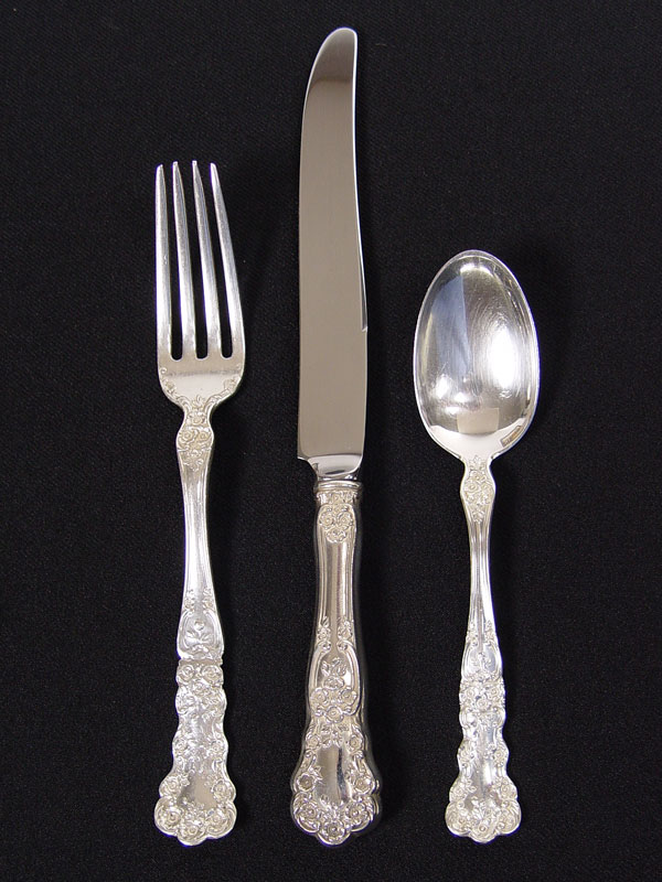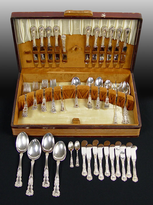 GORHAM BUTTERCUP STERLING FLATWARE SERVICE: Approx. 55 pieces in the Buttercup pattern by Gorham to include 9 forks (7'', note 4 are monogrammed and slightly smaller), 10 salad forks (6 1/4''), 20 teaspoons (5 3/4'', 3 monogrammed), 10 hollow knives (8 3/4''), hollow butter (6 1/4''), 10 solid butter (6''), 2 sugar scoops (6'', one monogrammed), 4 tablespoons (8 1/4'', monogrammed), pierced tablespoon (8 3/8''), salad serving fork (8 3/4'', monogrammed), 2 cocktail forks (5 1/2''), 5 demitasse spoons (4 1/8'', note 3 are heavily damaged). Approx 72.8 troy oz. Sold with wood silver chest, 3 7/8'' x 18 3/4'' x 11 3/4'', note heavy scratches to chest.