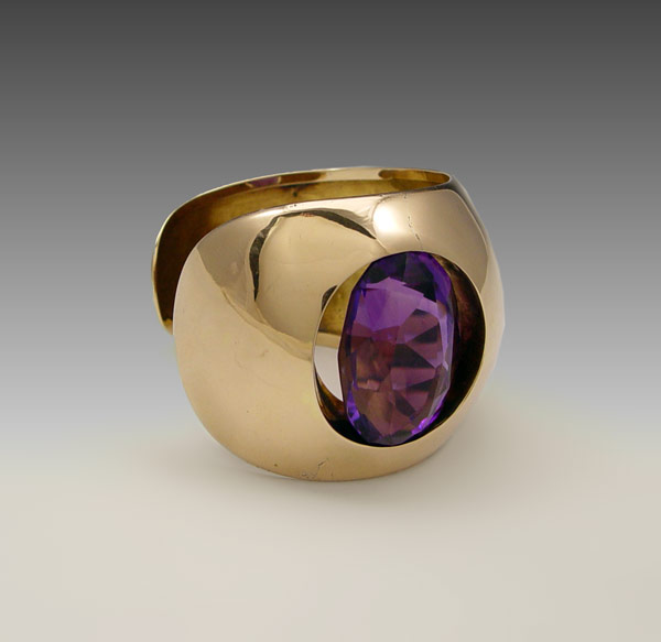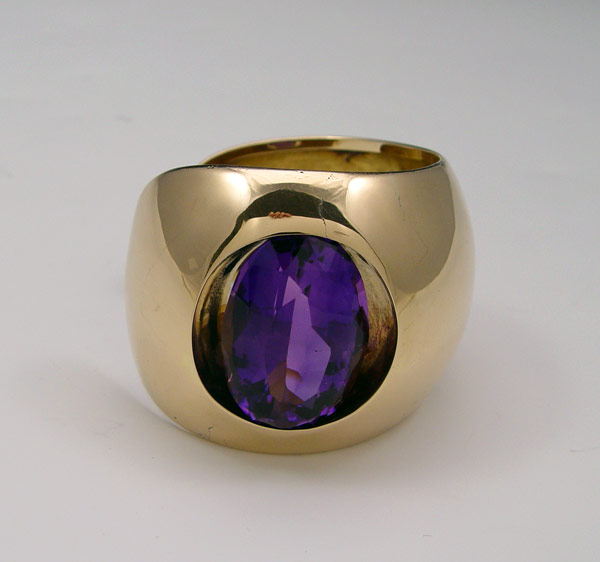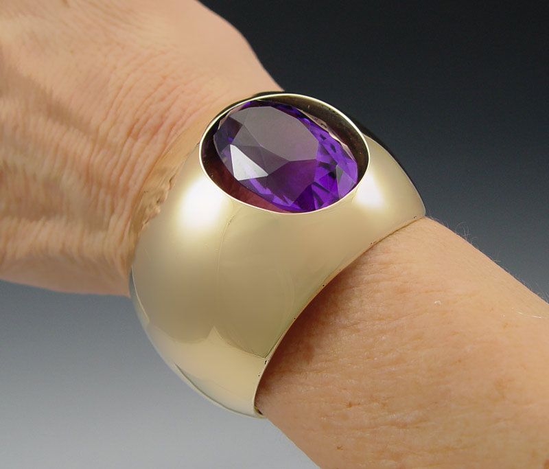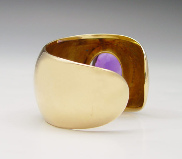 ANTONIO PINEDA 14K GOLD AMETHYST CUFF BRACELET: 14K yellow gold cuff bracelet contains one oval shaped mixed cut amethyst. Weight: 50.00 Ct. Approx. The amethyst is channel set. Gold Weight: 68.5 grams Approx. Bears the Pineda backstamp. Outer rim measures 7'' if circle complete, 1'' opening between ends, interior measures approx. 2 1/8'' x 1 7/8''. Please note very slight cracks on edges of gold.