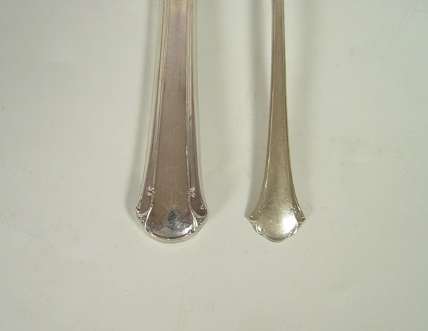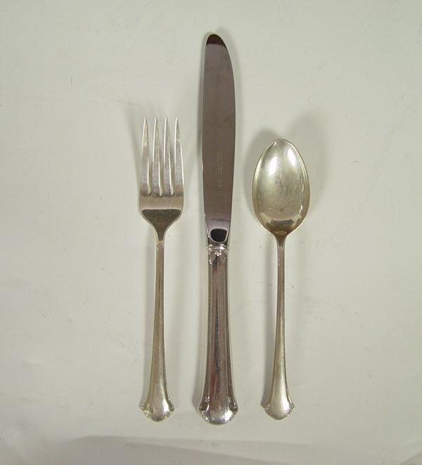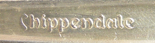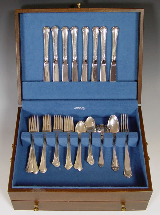 TOWLE CHIPPENDALE STERLING FLATWARE SET: Approx. 31 piece in the Chippendale pattern by Towle to include 8 forks (7 1/4''), 8 salad forks (6 5/8''), 7 teaspoons (5 1/4''), 8 hollow knives (8 3/4'') No monograms. Set is sold with Wallace sterling spoon (7'', monogrammed), Whiting pierced serving ladle (4 1/8'', monogrammed). Approx 32.3 troy oz. Comes in single drawer silver chest, 6 1/4'' x 15'' x 11 1/2''