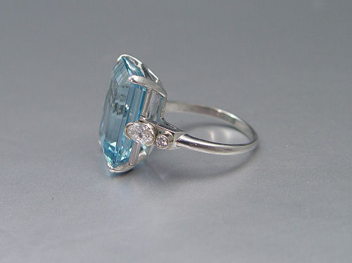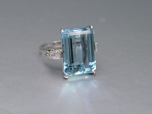 PLATINUM 12 CT BRAZILIAN AQUAMARINE RING WITH DIAMONDS: Platinum ring featuring an approx. 11.34 Ct untreated emerald cut aquamarine, VVS clarity, vslgB hue, 2-3 tone and 2-3 saturation. The aqua is flanked by two oval brilliant cut diamonds and two round brilliant cut diamonds. The aquamarine is prong set, diamonds are half bezel and bezel set. Sold with current Florida Diamond Appraisers GIA graduates appraisal for $8,250. Est. $4000/6000**