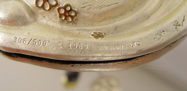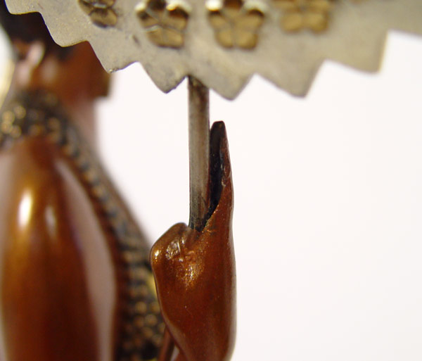 CONDITION: Small discoloration under her left wrist, maybe discolored at the foundry.