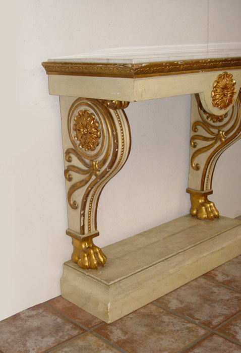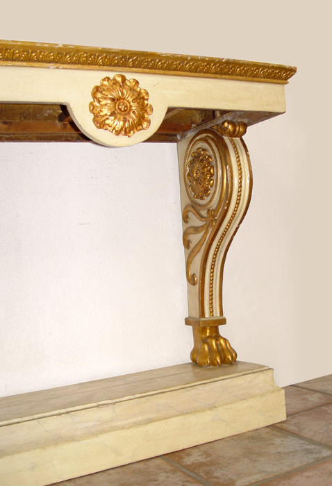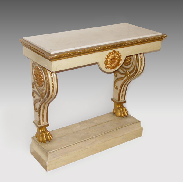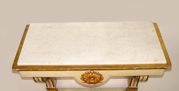 19TH C SWEDISH MARBLE TOP PIER TABLE: Parcel gilt, painted finish, white marble top table, 35'' x 37'' x 17''. There is some wear to the finish.